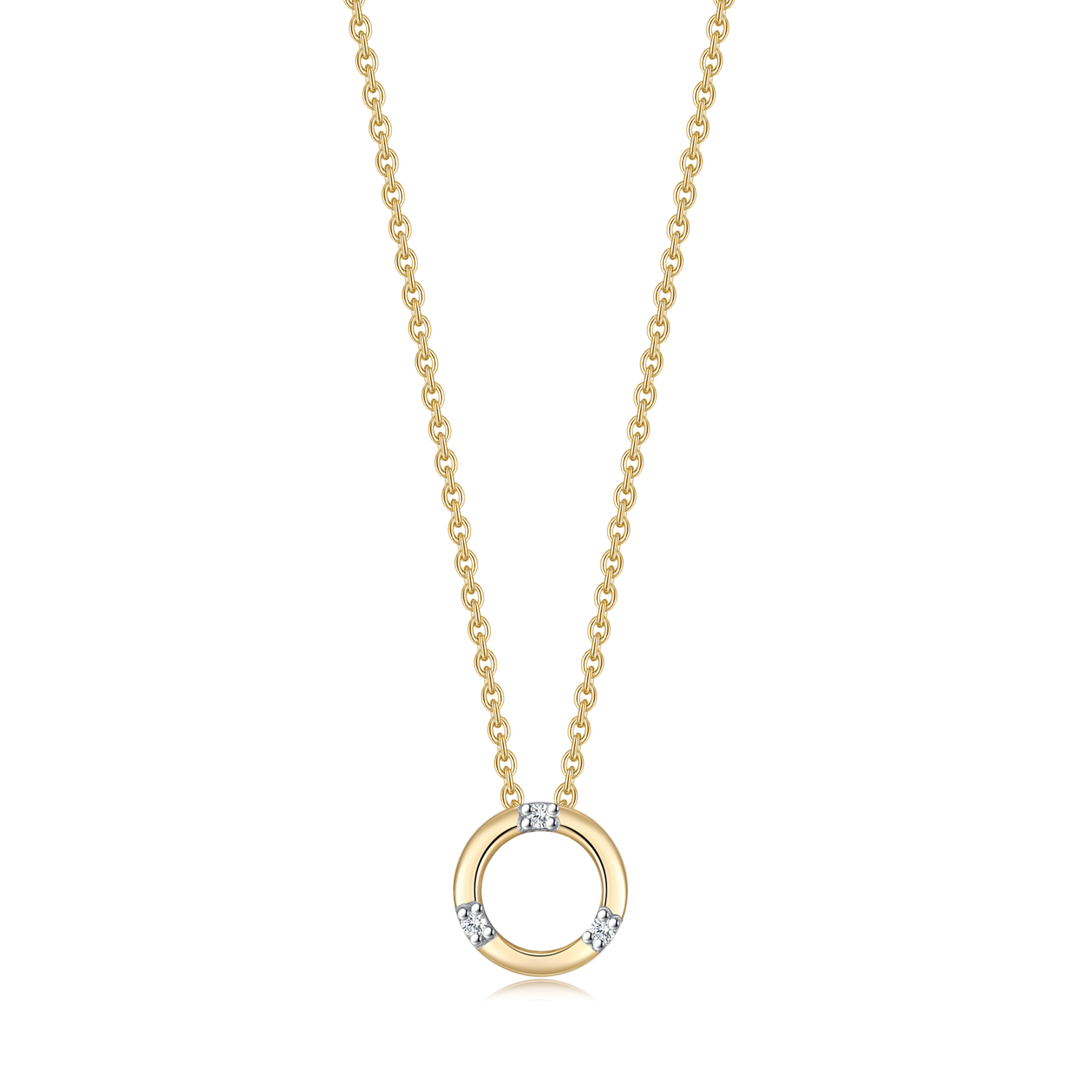 Elegant og tidløs 14 kt. guld halskæde med et smukt cirkelformet vedhæng, der prydes af tre funklende syntetiske cubic zirconia-sten. Smykket kombinerer klassisk design med et moderne udtryk, perfekt til både hverdag og fest. Den forgyldte sølvkæde fremhæver det eksklusive look og gør halskæden ideel som gave eller til at forkæle dig selv.