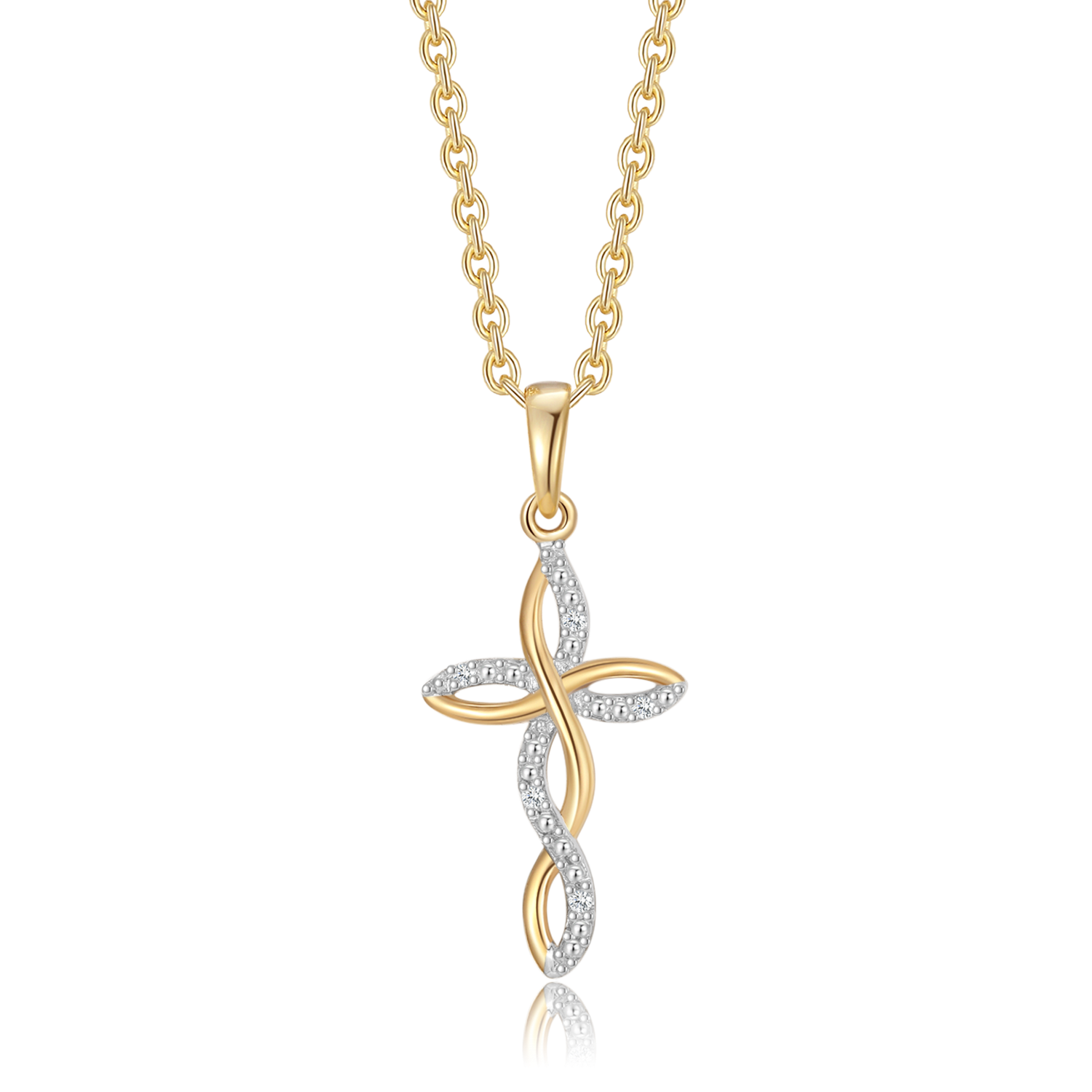 Elegant 14 kt. guld halskæde med et unikt vedhæng formet som et evighedstegn og kors, smukt dekoreret med funklende syntetiske cubic zirconia. Smykket symboliserer tro og uendelig kærlighed, hvilket gør det til en betydningsfuld gave eller et personligt statement. Den sølvforgyldte kæde fuldender det sofistikerede design og giver et tidløst udtryk.