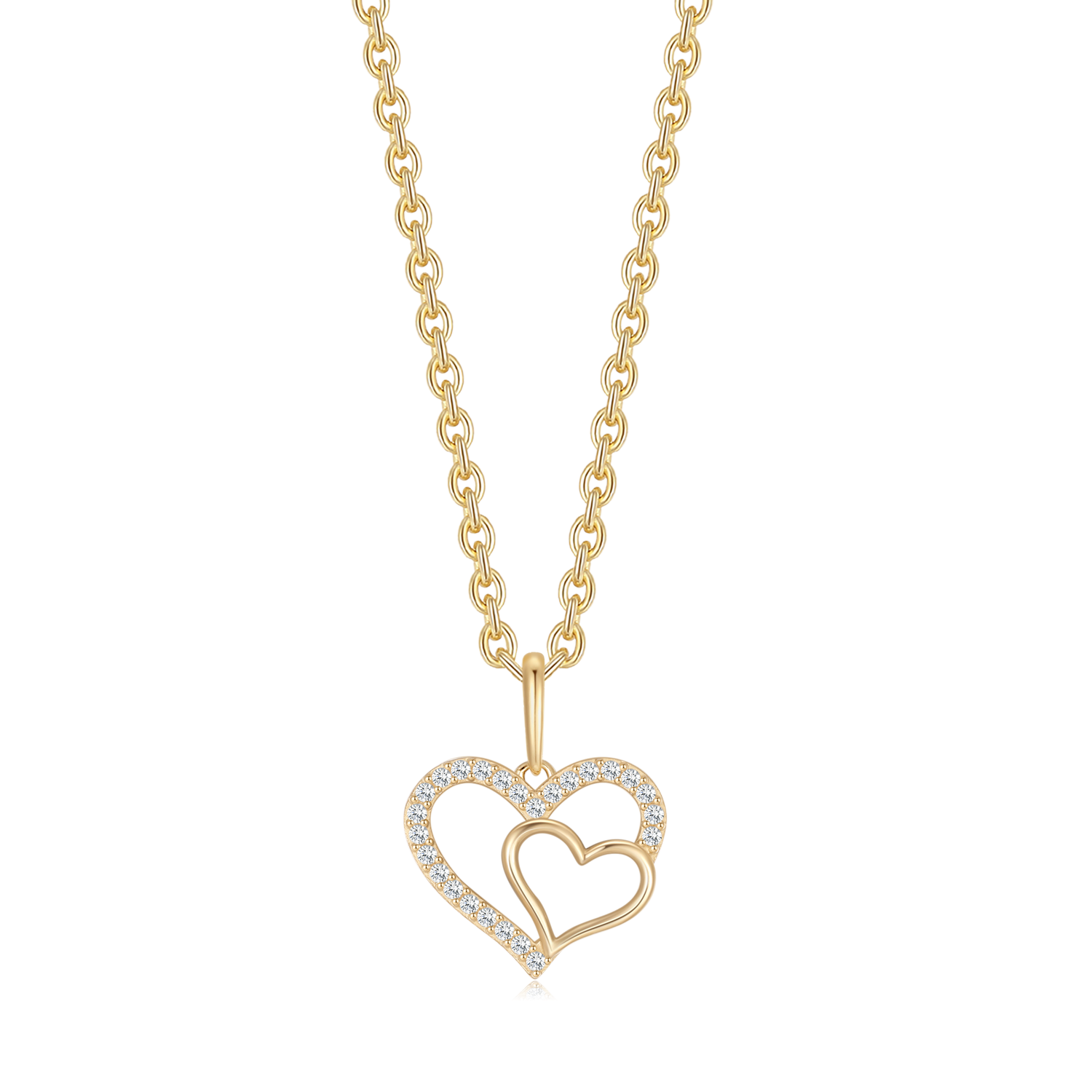 Elegant 14 kt. guld halskæde med et smukt dobbelt hjertevedhæng, hvor kanten af hjertet er prydet med funklende syntetiske cubic zirconia. Det romantiske og tidløse design giver halskæden et feminint og eksklusivt udtryk, perfekt til både hverdag og særlige lejligheder. Den justerbare sølvforgyldte kæde sikrer komfort, mens stenene tilføjer et subtilt strejf af glamour.