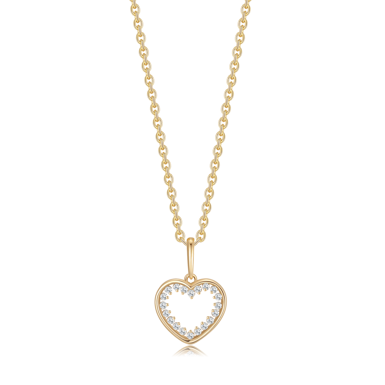 Elegant 14 kt. guld halskæde med et klassisk hjertevedhæng, smukt udsmykket med funklende syntetiske cubic zirconia langs kanten. Det tidløse og feminine design gør halskæden ideel til både hverdag og særlige lejligheder. Den justerbare sølvforgyldte kæde giver en behagelig pasform, mens de glitrende sten tilføjer et strejf af luksus og romantik. En perfekt gave til en, du holder af.