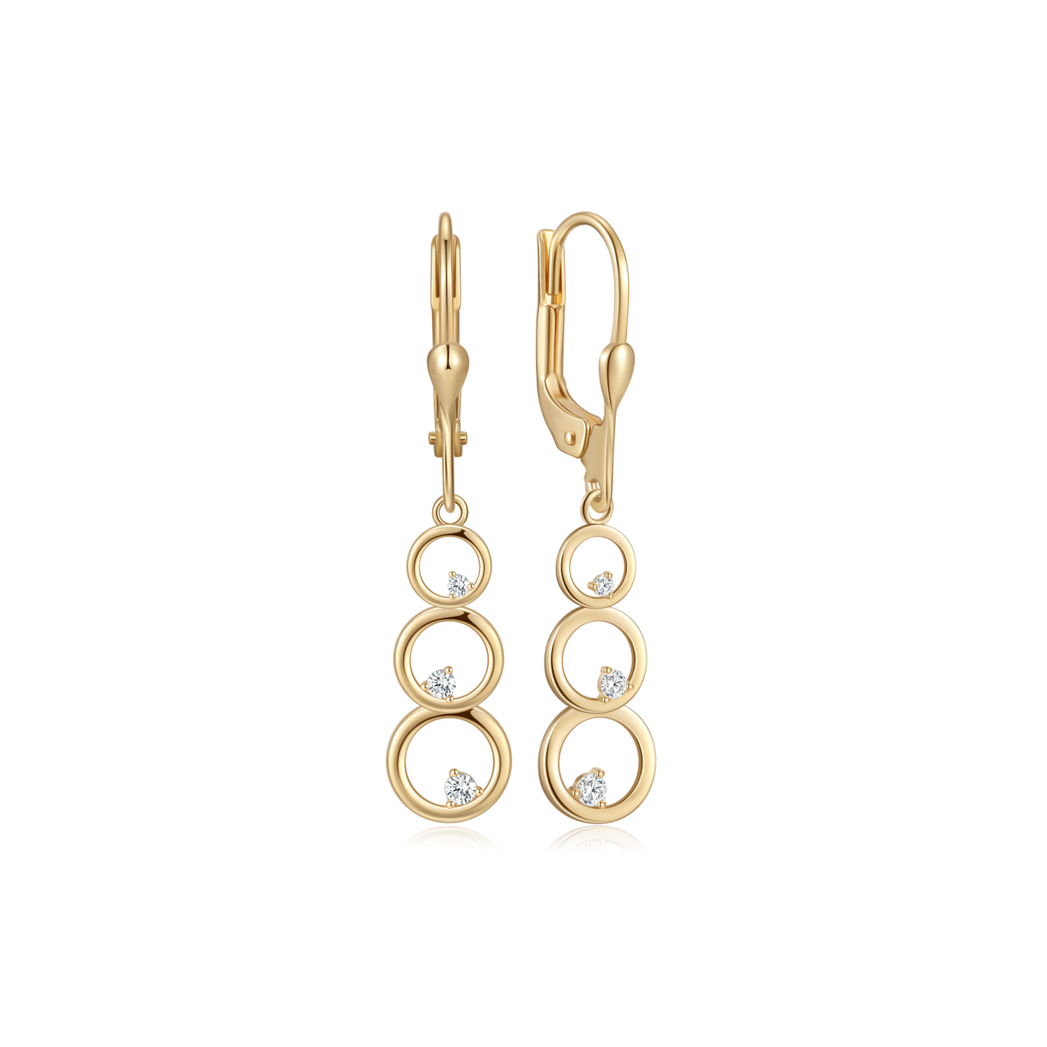 Elegant 14 kt. guld ørehænger bestående af tre forskellige cirkler, smukt udsmykket med funklende syntetiske cubic zirconia sten. Det moderne design giver et livligt og eksklusivt udtryk, der reflekterer lyset på en sofistikeret måde. Et tidløst smykke, der kombinerer klassisk guld med moderne glans – perfekt til både hverdag og fest.