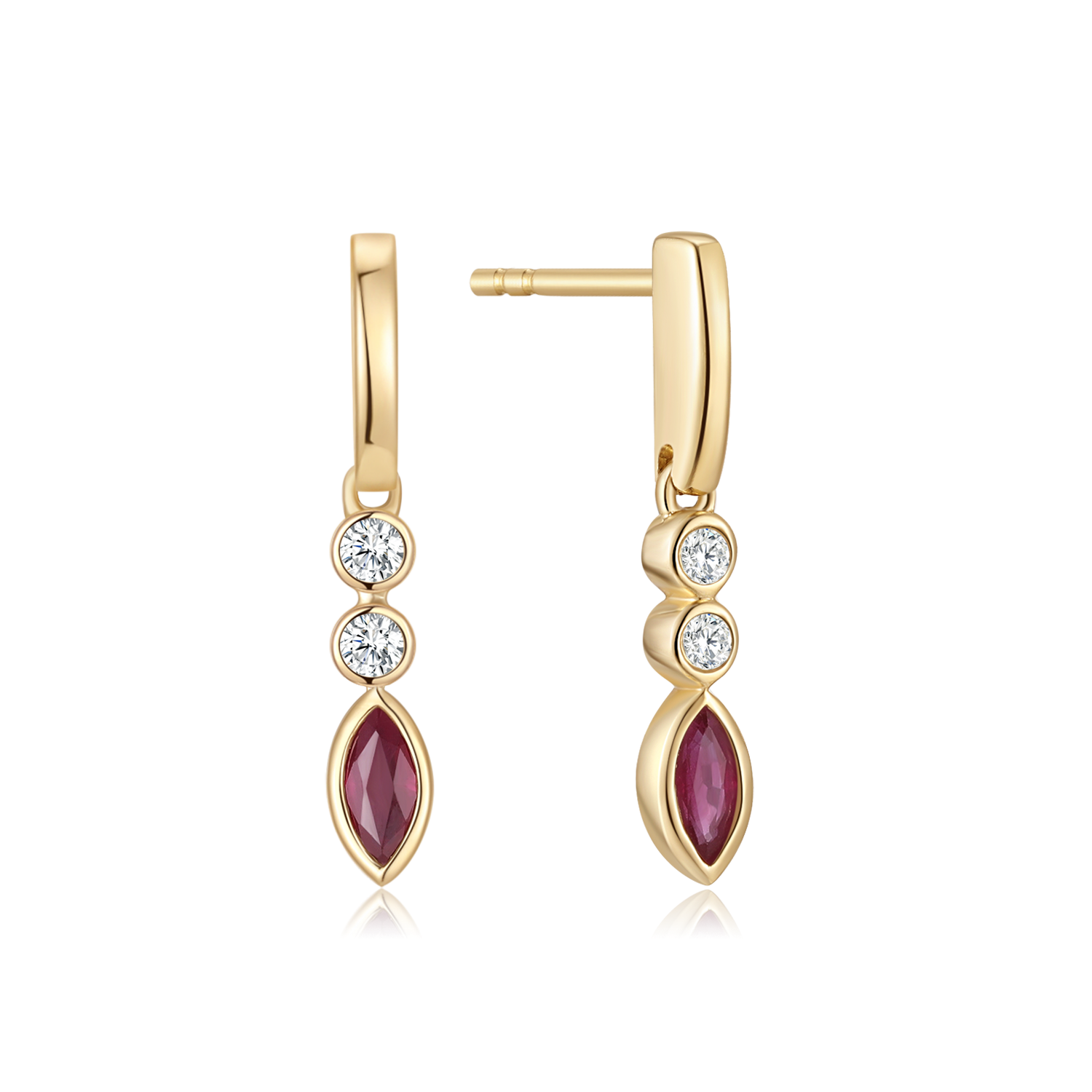 Disse eksklusive ørestikker i 14 karat guld kombinerer klassisk elegance med farverig luksus. Designet som en slank, aflang pind, er de smukt prydet med to brillanter og en rubin, der tilfører et raffineret og feminint udtryk. Den varme guldglød fremhæver stenens farvespil, hvilket gør disse ørestikker perfekte til både hverdagsbrug og særlige anledninger.