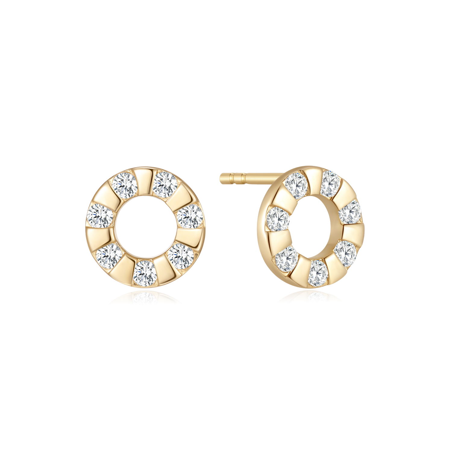 Disse elegante ørestikker i 14 karat guld har et klassisk cirkeldesign prydet med syv funklende syntetiske cubic zirconia, der smukt reflekterer lyset. Kombinationen af det gyldne metal og de klare sten giver et luksuriøst og feminint udtryk. Perfekte til både hverdagsbrug og festlige lejligheder – et tidløst smykke, der tilføjer glans og elegance til enhver stil.
