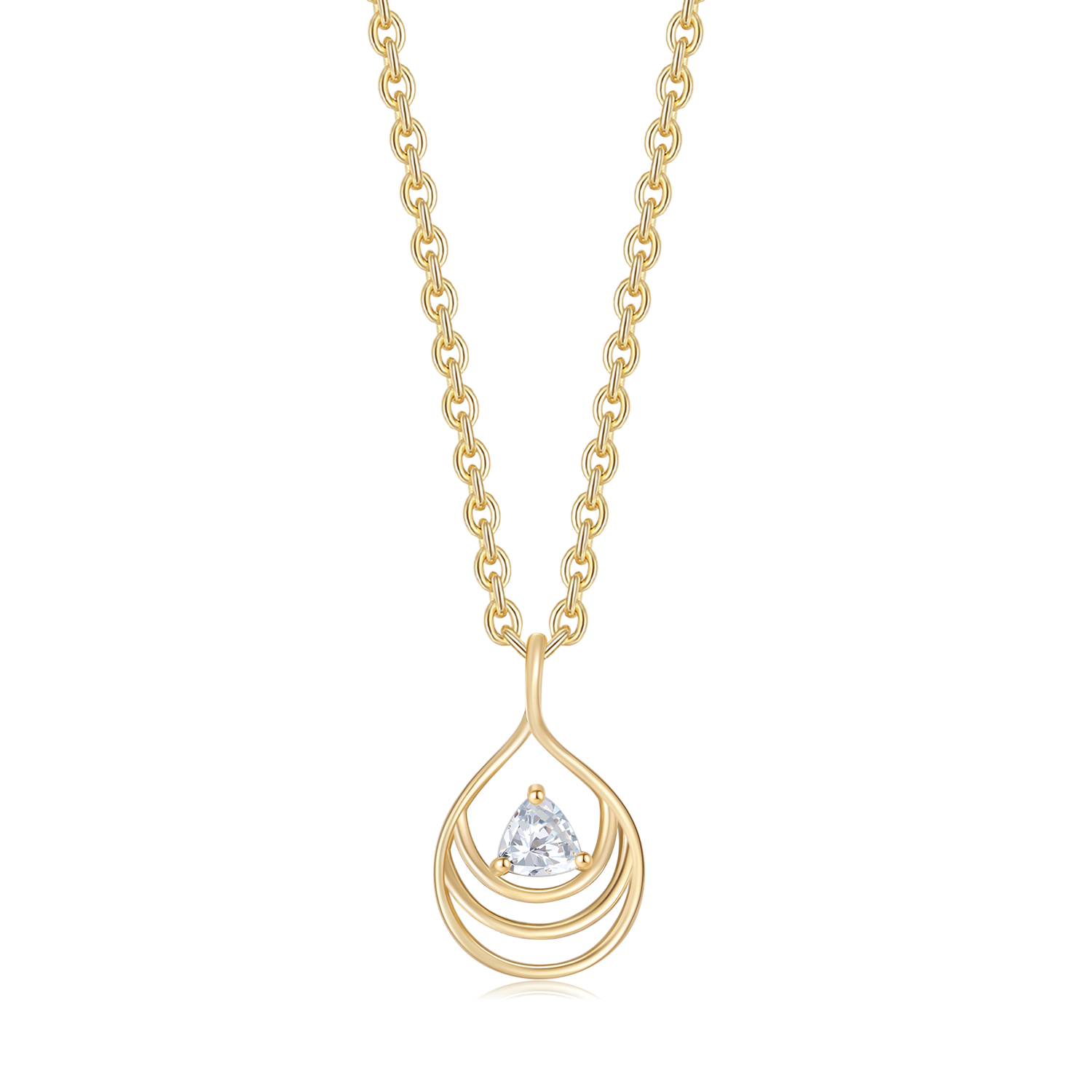 Elegant 8 kt. guld halskæde med et dråbeformet vedhæng, dekoreret med tre streger og en funklende syntetisk cubic zirconia. Dette moderne og stilfulde smykke tilføjer et sofistikeret touch til ethvert outfit og passer perfekt til både hverdag og særlige lejligheder. Den sølvforgyldte kæde kan justeres mellem 42 og 45 cm, hvilket sikrer en behagelig og fleksibel pasform.
