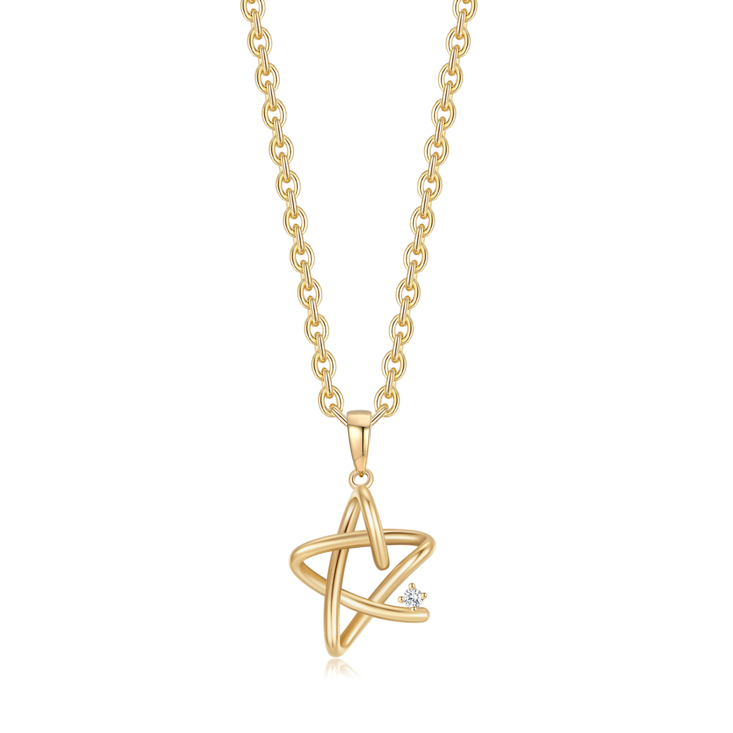 Smuk 8 kt. guld halskæde med et stjerneformet vedhæng, udsmykket med en funklende syntetisk cubic zirconia. Dette elegante og tidløse smykke tilføjer et subtilt glimt af luksus til ethvert outfit og passer perfekt til både hverdag og festlige lejligheder. Den sølvforgyldte kæde kan justeres mellem 42 og 45 cm, hvilket sikrer en behagelig og fleksibel pasform.
