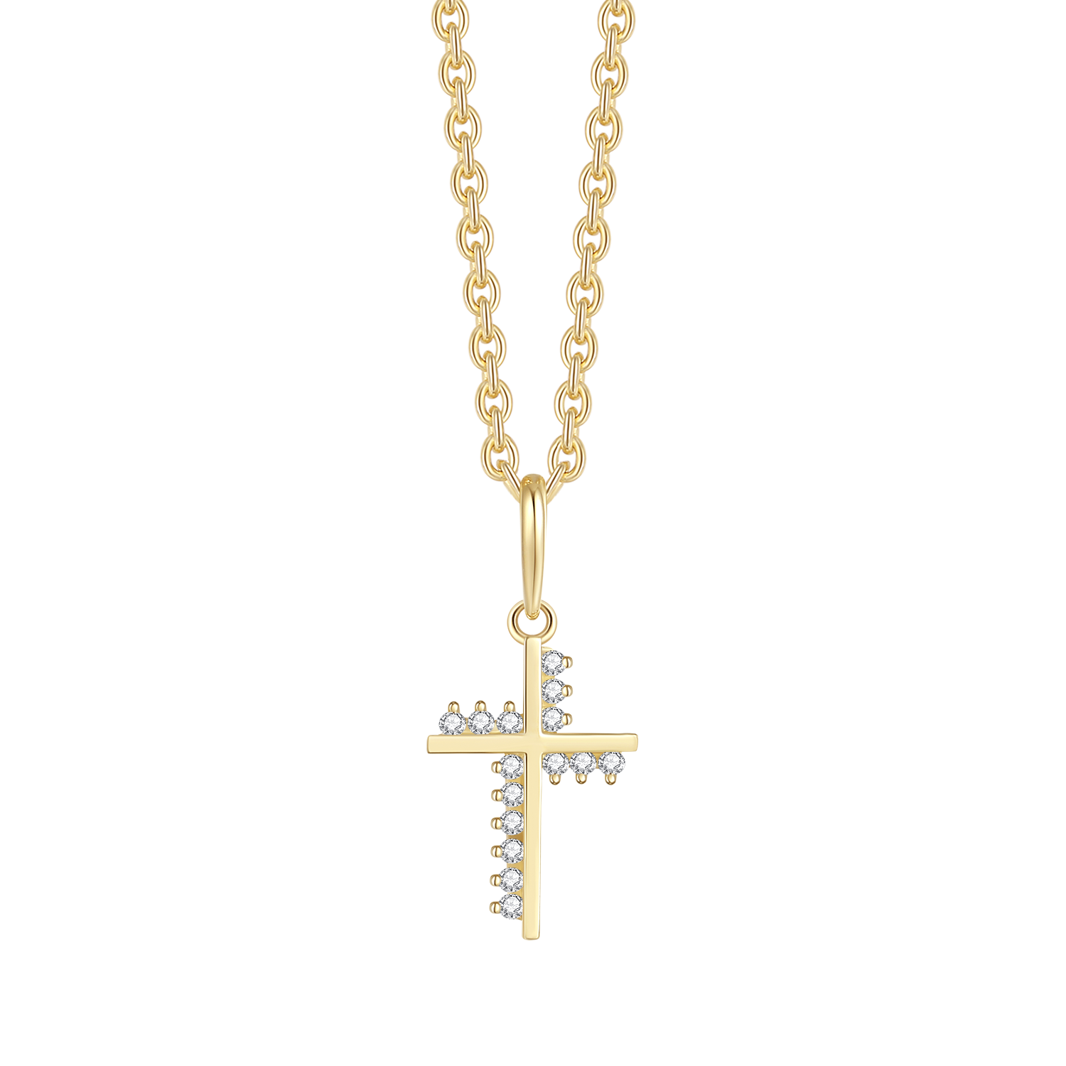 Denne elegante 8 kt. guldhalskæde er den perfekte tilføjelse til din smykkesamling. Halskæden er designet med et 8 kt. guld vedhæng i form af et kors, der er prydet med syntetisk cubic zirconia på stolperne, som giver et sofistikeret og tidløst look. Kæden er sølvforgyldt og justerbar i længden fra 42 til 45 cm, hvilket sikrer en behagelig og alsidig pasform.