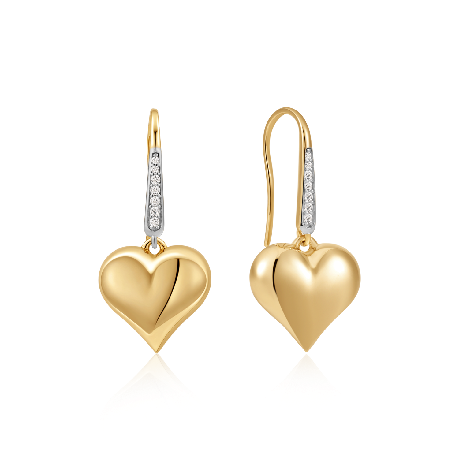 Romantisk 8 kt. guld ørehænger formet som et lukket hjerte, smukt besat med funklende syntetiske cubic zirconia. Øreringene udstråler varme, kærlighed og tidløs elegance. Det delikate design fanger lyset på fortryllende vis og tilfører et feminint og eksklusivt præg til ethvert outfit. Perfekte som gave til en du holder af – eller som forkælelse til dig selv.