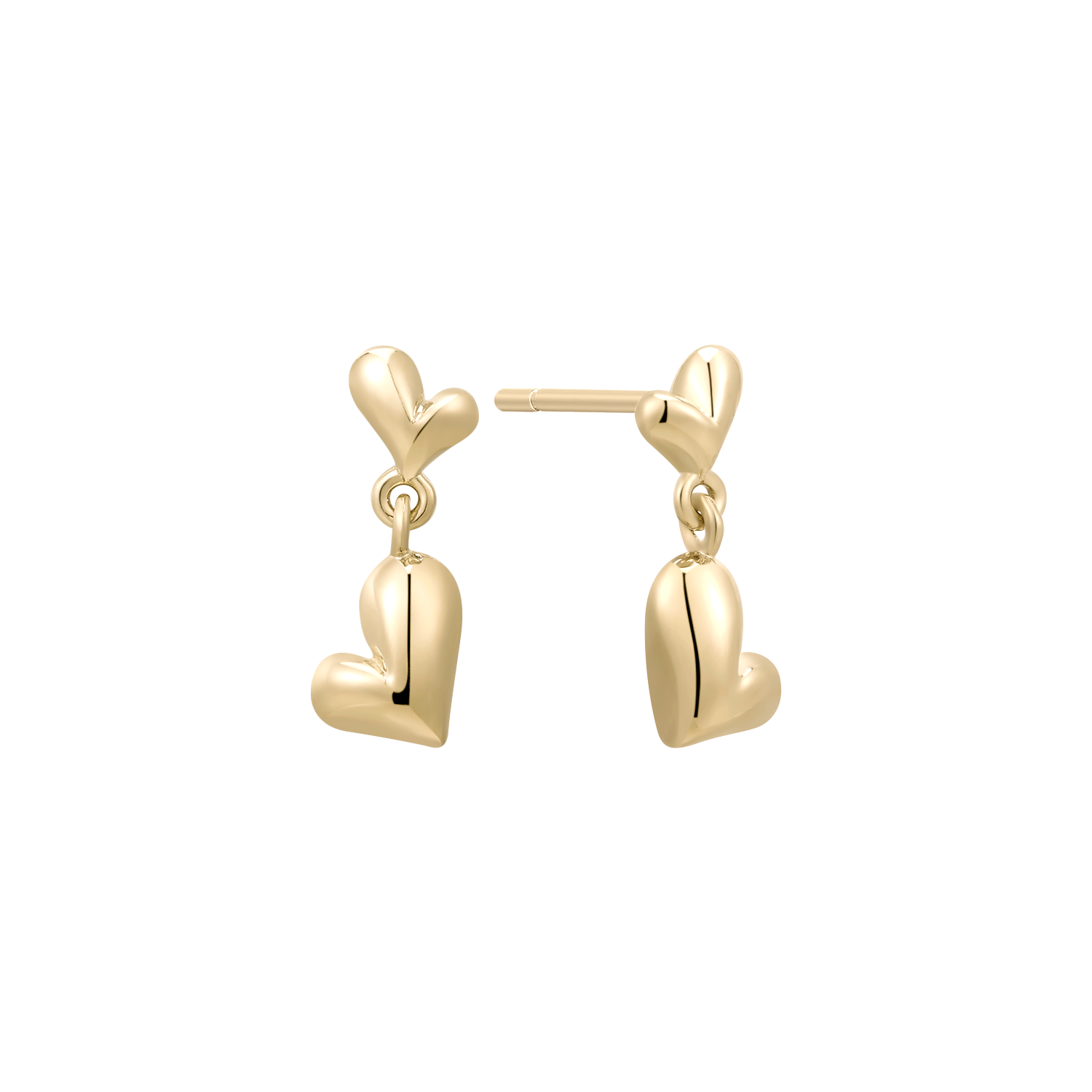 Romantisk 8 kt. guld ørehænger med to skæve hjerter, hvor det større hjerte elegant hænger fra det mindre. Designet symboliserer kærlighed og sammenhørighed på en moderne og legende måde. Øreringene har et feminint og tidløst udtryk, der passer perfekt til både hverdag og særlige lejligheder. Et delikat smykke, der fanger lyset og spreder varme og glans.