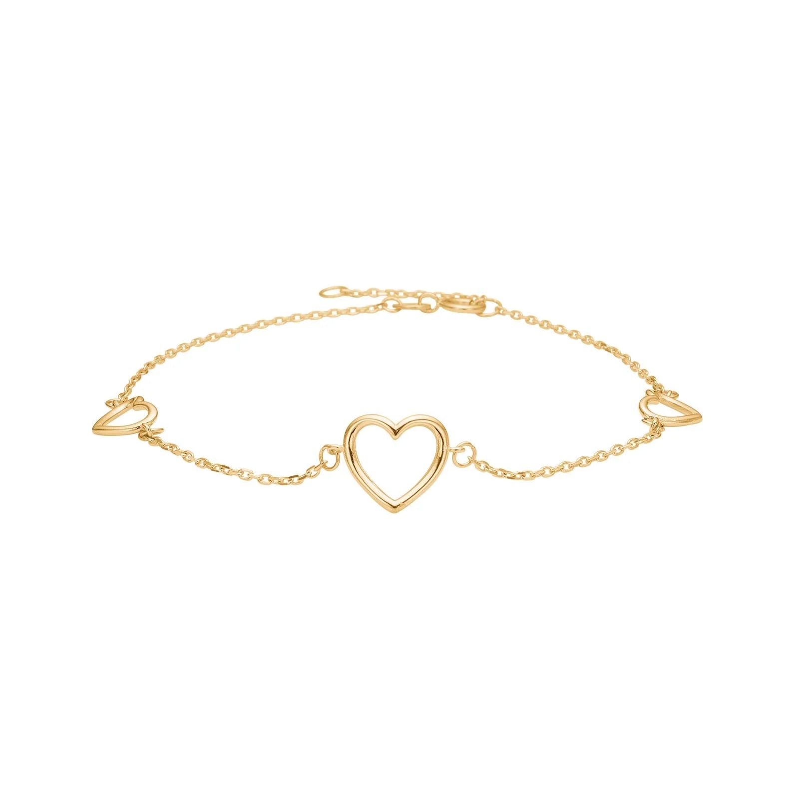 Et elegant armbånd i 8 kt. guld, der kombinerer tidløs skønhed med romantisk symbolik. Armbåndet prydes af tre fine hjerter, som giver et feminint og stilrent udtryk. Den blankpolerede overflade fremhæver guldet og tilfører et eksklusivt touch, der gør smykket velegnet både til hverdag og festlige lejligheder. Med sin enkle, men betydningsfulde udformning er dette armbånd en smuk gaveidé eller et personligt valg til enhver kvinde.