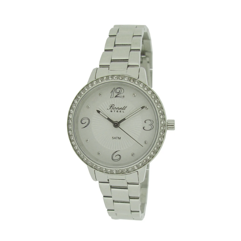 Bonett smykkeur Ø32 mm er et elegant dameur med et klassisk og stilrent design, perfekt til både hverdag og fest. Uret har en smuk sølvfarvet urskive med tydelige tal og fine stenmarkeringer, som giver et eksklusivt look. Den solide stållænke sikrer høj komfort og et tidløst udtryk. Med en vandtæthed på 5 ATM tåler uret stænk og almindelig daglig brug. Et ideelt valg til dig, der ønsker et smykkeur med kvalitet og feminin elegance.
