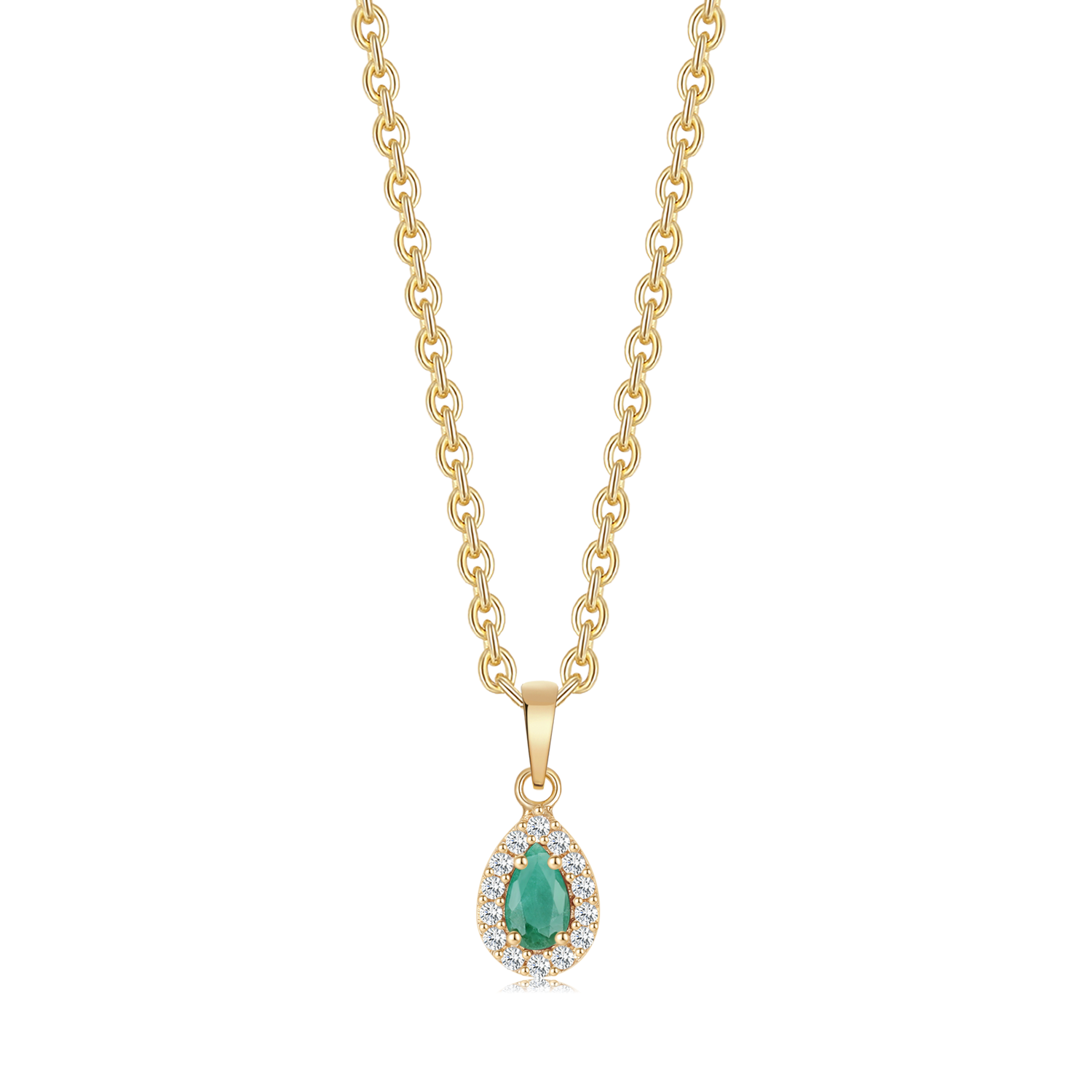 Denne fortryllende halskæde i 8 kt. guld har et elegant ovalt vedhæng med en strålende smaragd omgivet af funklende syntetiske cubic zirconia. Smykket kombinerer klassisk luksus med tidløs skønhed og tilføjer et strejf af farve og elegance til enhver stil. Den sølvforgyldte kæde har en justerbar længde, hvilket gør den både behagelig og alsidig at bære.
