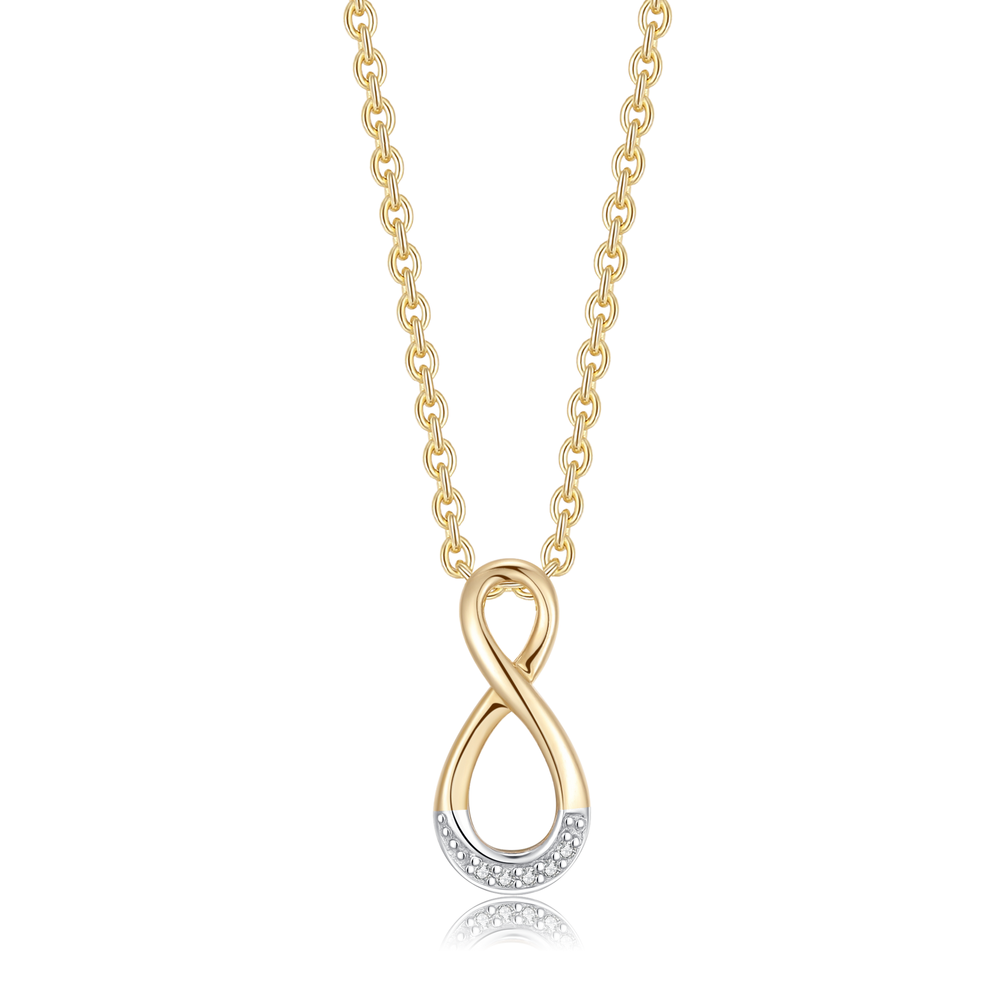 Elegant guld halskæde i 8 kt. guld med et smukt evighedstegn som vedhæng, prydet med funklende syntetiske cubic zirconia. Halskæden symboliserer evig kærlighed og tidløs elegance. Den sølvforgyldte kæde fremhæver vedhængets glans og gør smykket perfekt til både daglig brug og særlige lejligheder.