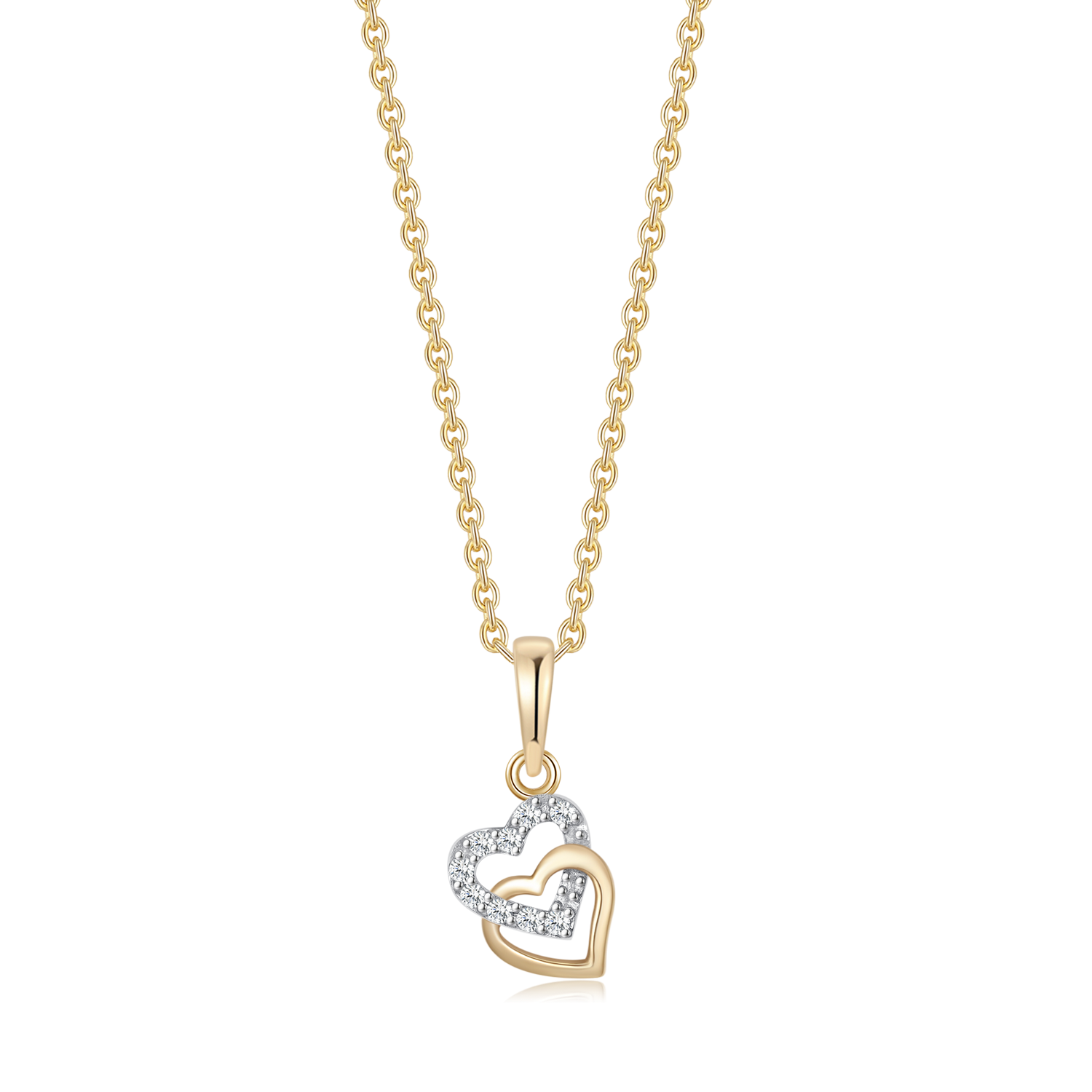 Elegant guld halskæde med et smukt dobbelt hjertevedhæng, prydet med glitrende syntetiske cubic zirconia. Den fine, sølvforgyldte kæde kan justeres mellem 42 og 45 cm, hvilket gør den perfekt til enhver lejlighed. Et tidløst og romantisk smykke, der både kan bruges til hverdagsbrug og særlige begivenheder, eller som en personlig gave til en du holder af.