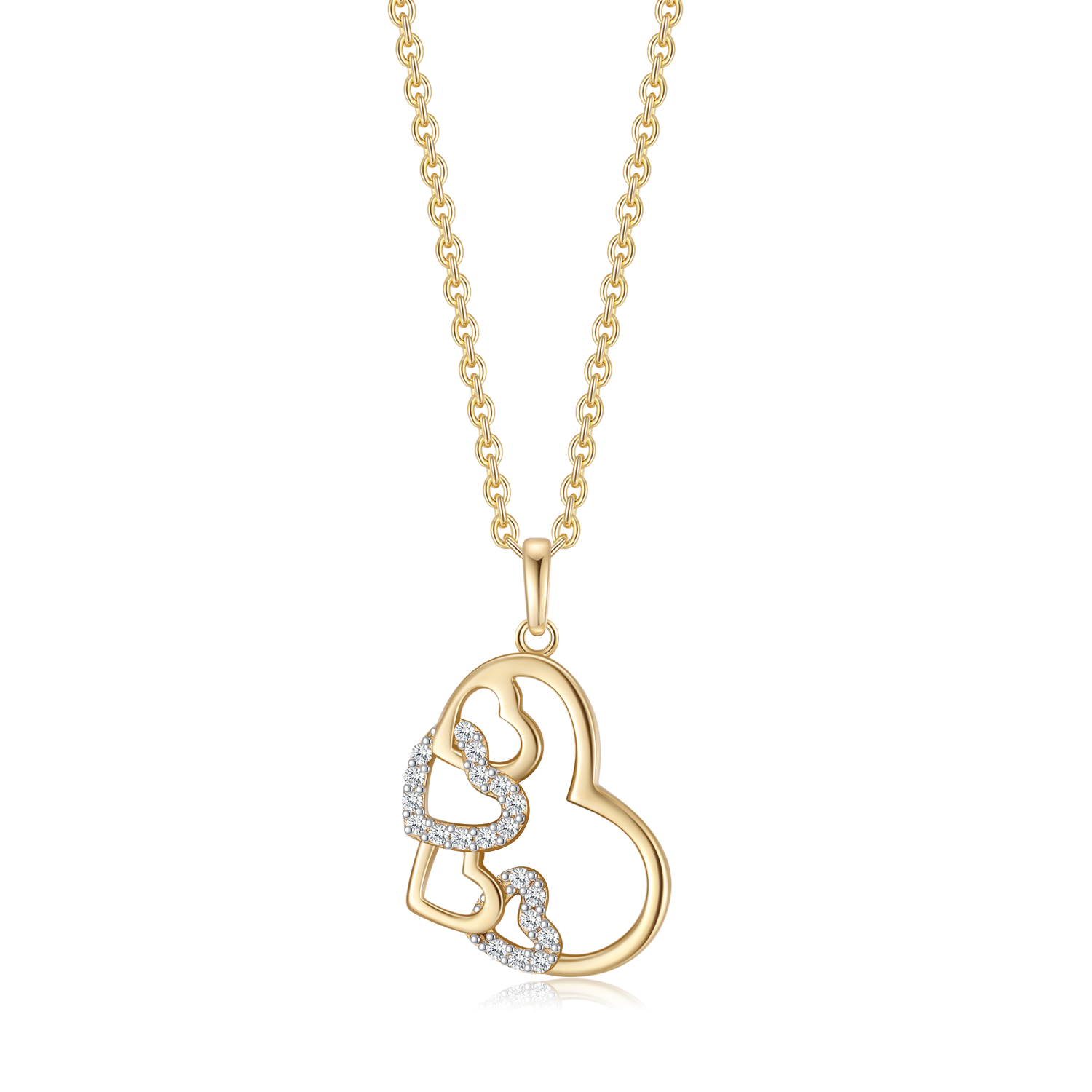 Elegant guld halskæde med et stort hjertevedhæng, omgivet af fire små hjerter, alle dekoreret med glitrende syntetiske cubic zirconia. Dette romantiske og feminine smykke symboliserer kærlighed og nærhed og er perfekt som gave til en du holder af eller som et tidløst tilbehør til dig selv. Den sølvforgyldte kæde kan justeres mellem 42 og 45 cm og fuldender det elegante udtryk.