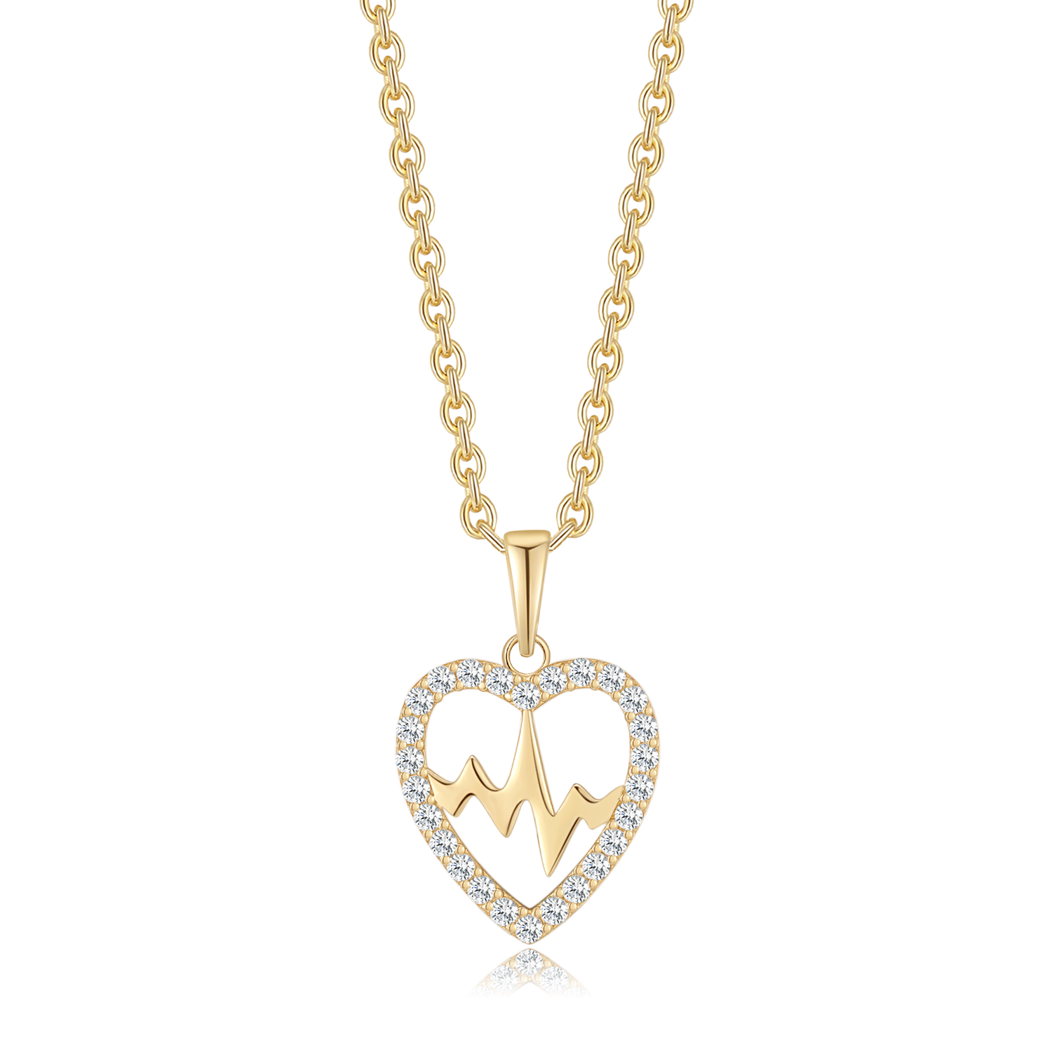Elegant guld halskæde med et hjertevedhæng, hvor kanten er dekoreret med funklende syntetiske cubic zirconia, og midten prydes af en elegant bølgedesign. Dette smykke kombinerer romantik og moderne stil og er perfekt som gave eller til at fuldende dit eget look. Den sølvforgyldte kæde kan justeres mellem 42 og 45 cm og giver et tidløst og sofistikeret udtryk.