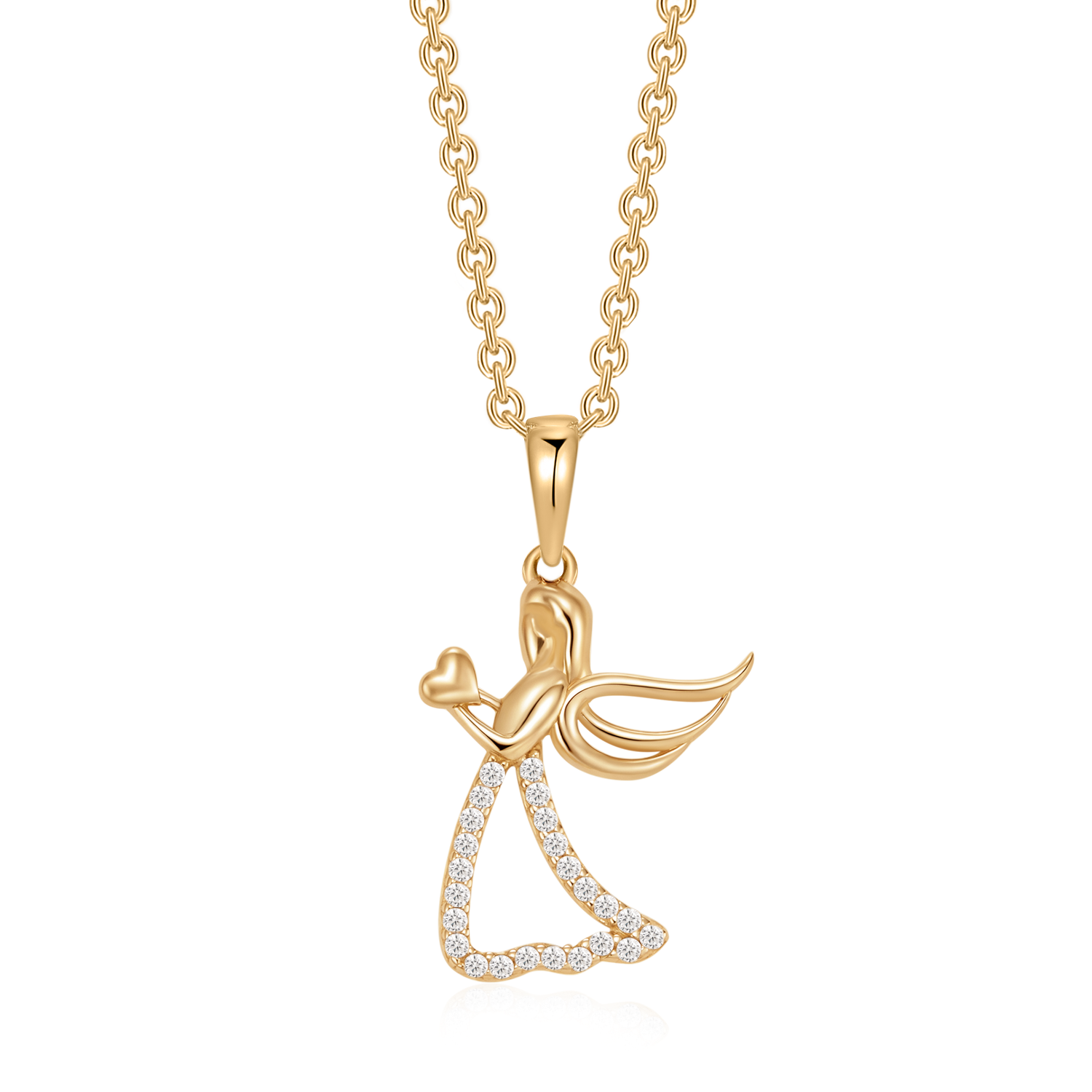 Elegant guld halskæde med et smukt englevedhæng, der holder et hjerte og er dekoreret med funklende syntetiske cubic zirconia. Dette smykke symboliserer beskyttelse, kærlighed og nærvær, hvilket gør det til en perfekt gave til en du holder af eller som et meningsfuldt tilbehør til dig selv. Den klassiske og tidløse design gør halskæden velegnet til alle lejligheder.