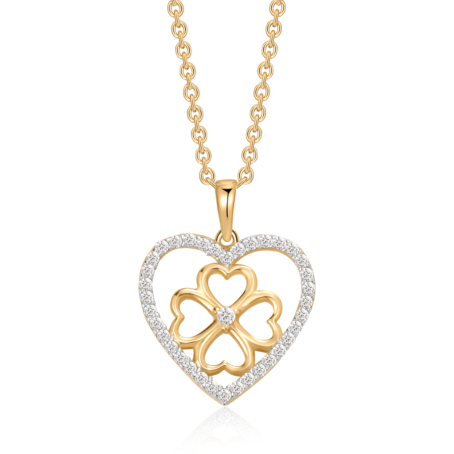 Smuk guld halskæde med et hjertevedhæng og en unik blomst af fire små hjerter, dekoreret med funklende syntetiske cubic zirconia. Dette romantiske og feminine smykke, kaldet "Flower of Hearts", symboliserer kærlighed og nærhed. Perfekt som gave til en elsket eller som et elegant tilbehør til dig selv. Den klassiske og tidløse design passer til enhver lejlighed.