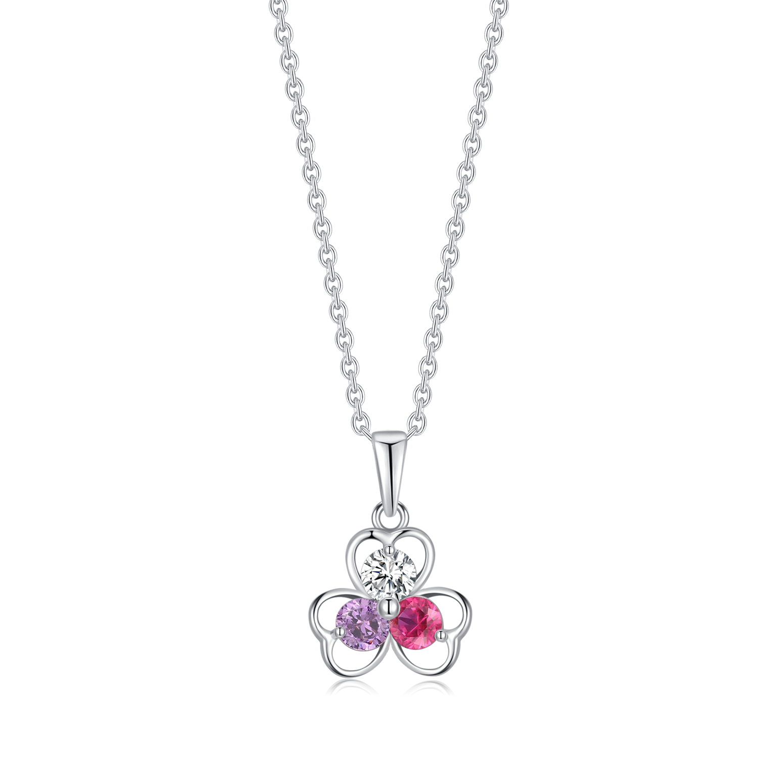 - Vedhæng: 3 hjerter med syntetiske cubic zirconia (klar, rubin og ametystfarvet)