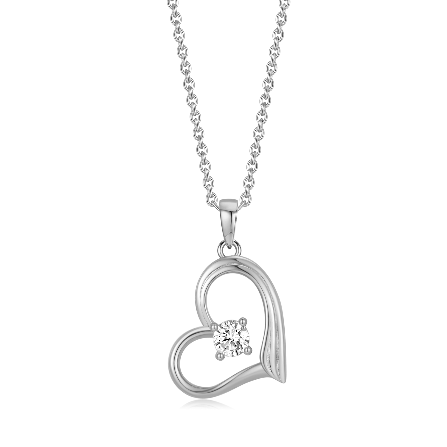 Elegant sølvhalskæde med et smukt rhodineret hjertevedhæng i et let skævt design, prydet med en funklende syntetisk cubic zirconia fæstnet i fire grabber. Smykket kombinerer romantik og moderne stil i ét tidløst udtryk. Fremstillet i ægte sølv med rhodinering, der beskytter mod anløbning og bevarer sin glans. Perfekt som gave eller til enhver lejlighed.