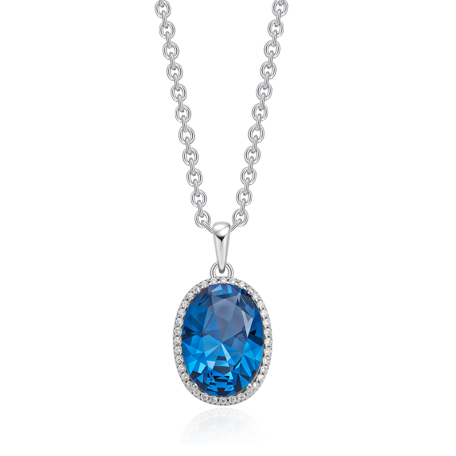 En eksklusiv rhodineret sølvhalskæde med et ovalt vedhæng, prydet med en strålende syntetisk London blå topas omgivet af funklende syntetiske cubic zirconia. Kombinationen af den dybblå sten og de klare zirkoner skaber et luksuriøst og elegant udtryk. Den rhodinerede overflade giver ekstra glans og beskytter mod anløbning – perfekt til både hverdag og fest.