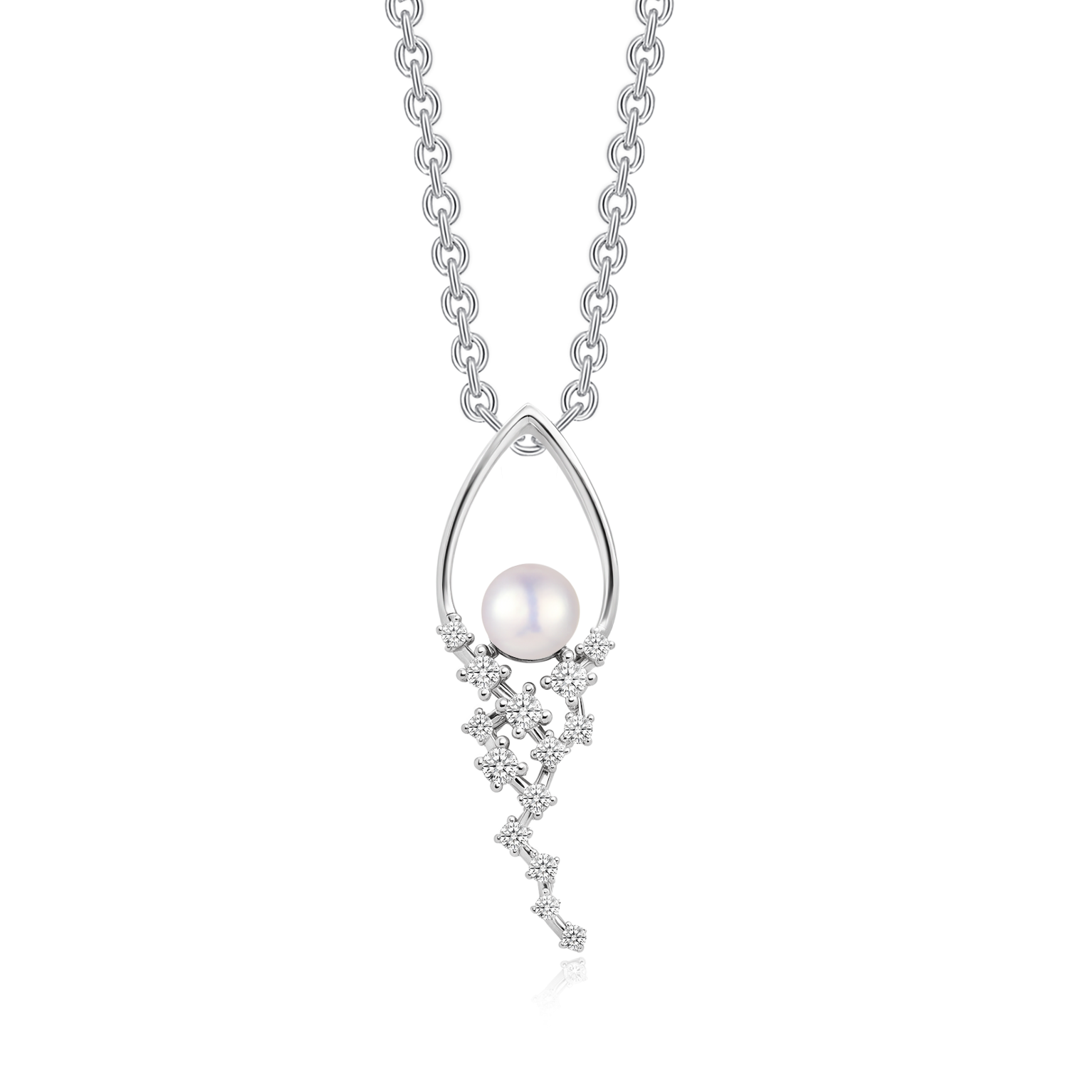Denne smukke sølvhalskæde har et rhodineret ovaldesign med dråbeformede detaljer og syntetiske cubic zirconia, samt en eksklusiv ferskvandsperle i midten. Kombinationen af perlen og de skinnende cubic zirconia giver halskæden et elegant og sofistikeret udtryk, perfekt til både formelle og uformelle anledninger.