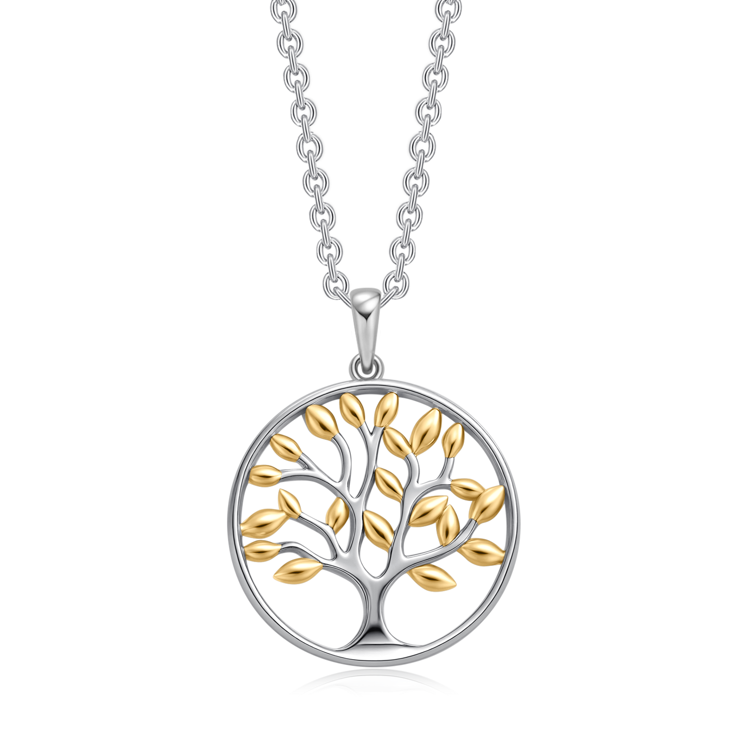 Denne smukke sølvhalskæde er designet med en cirkel, der viser Livets Træ, hvor bladene er forgyldte for et elegant og unikt udseende. Symbolikken bag Livets Træ repræsenterer vækst, styrke og forbundethed. Et smykke, der både er tidløst og meningsfuldt, perfekt til enhver, der ønsker at bære et symbol på livets skønhed og forbindelser.