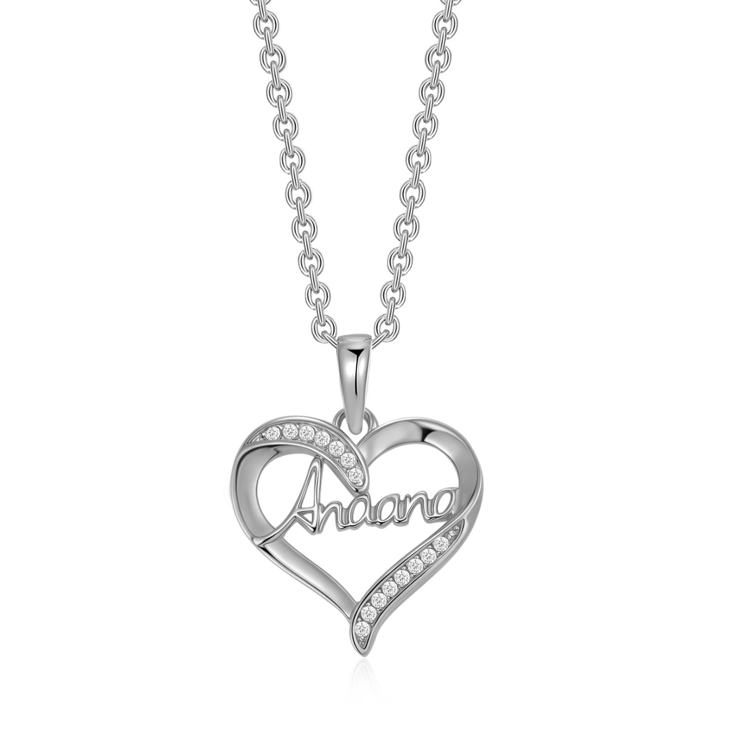 Denne elegante rhodinerede sølvhalskæde har et hjertevedhæng, smukt prydet med teksten "Anaana" og syntetiske cubic zirconia langs kanten. Smykket symboliserer kærlighed og varme, og den tidløse design gør det perfekt til både hverdag og specielle anledninger.