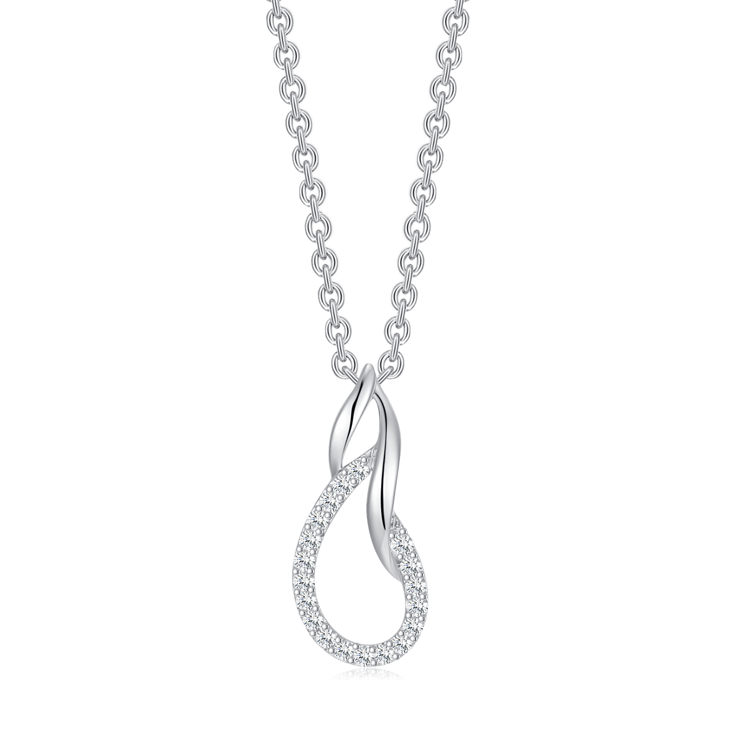 Denne raffinerede sølvhalskæde har et elegant, flettet dråbevedhæng, smukt udsmykket med funklende syntetiske cubic zirconia-sten. Smykket er fremstillet i rhodineret sterlingsølv, som giver en skinnende overflade og beskytter mod anløbning. Halskæden kombinerer tidløs elegance med et moderne udtryk og passer perfekt til både hverdagsbrug og festlige lejligheder.