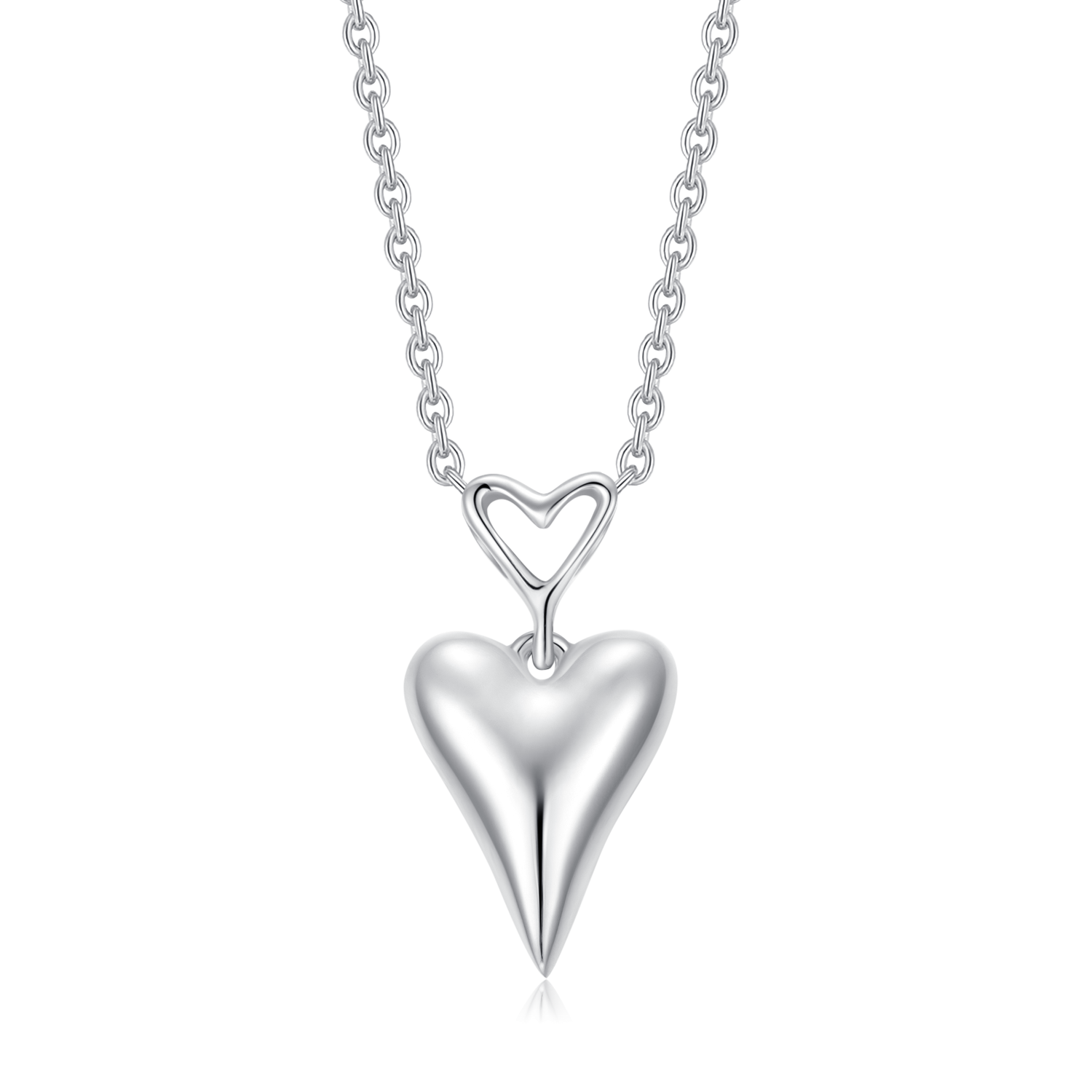 Denne charmerende sølvhalskæde har et rhodineret dobbelt hjerte-design, hvor det store hjerte er fyldt, og bagsiden er dekoreret med små hjerteformede huller. Halskæden er både romantisk og stilfuld, og dens rhodinerede finish giver den et elegant og holdbart udseende, der gør den til et perfekt valg til enhver særlig lejlighed.