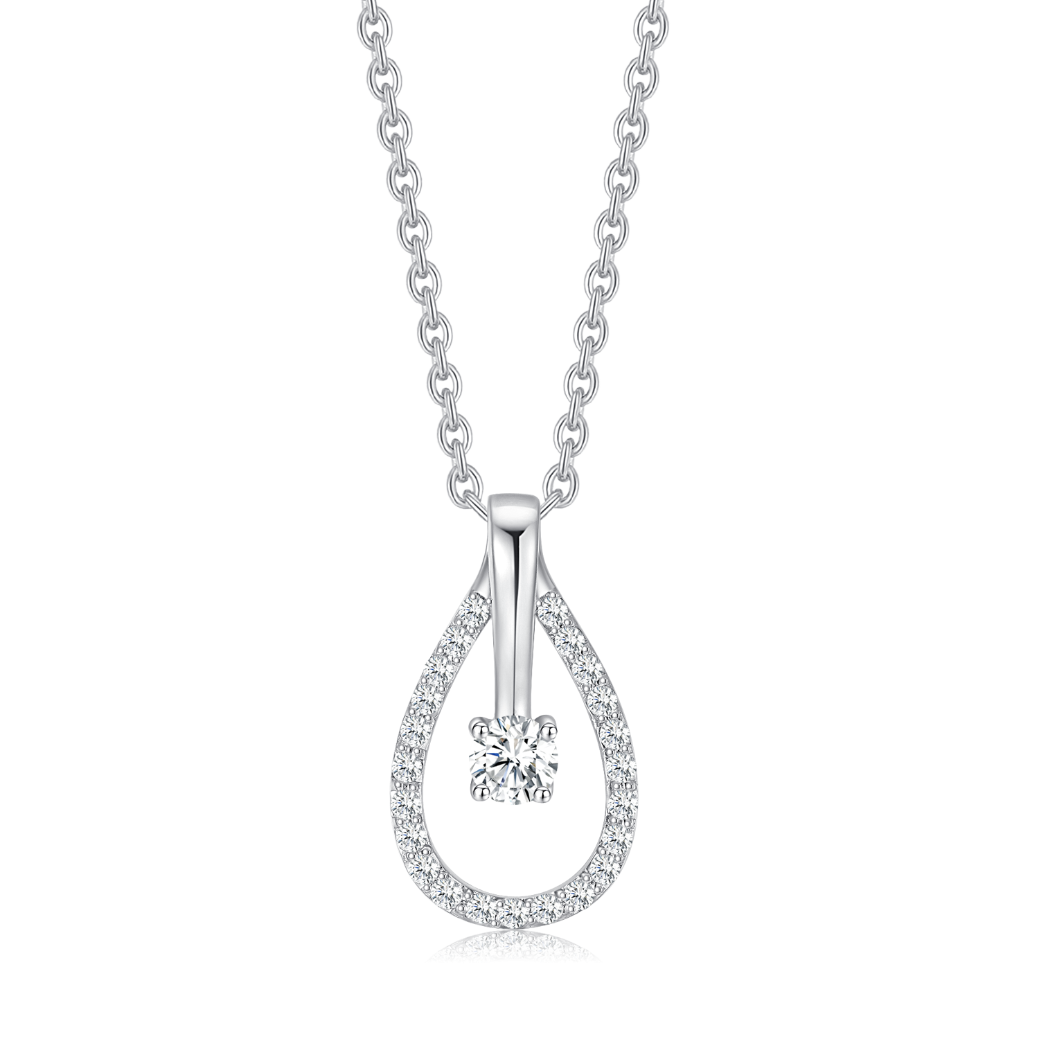 Denne elegante rhodinerede sølvhalskæde har en smuk dråbeform med syntetisk cubic zirconia i både midten og kanten, hvilket giver et funklende og sofistikeret udseende. Halskæden er ideel til både hverdag og fest, og den rhodinerede overflade sikrer både holdbarhed og en strålende finish.