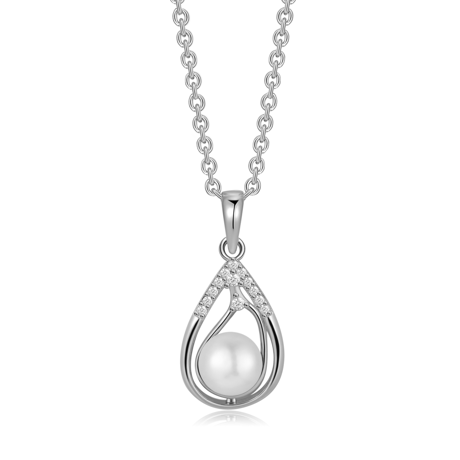 Denne elegante rhodinerede sølvhalskæde har et dobbelt dråbe-design, prydet med syntetiske cubic zirconia og en smuk ferskvandsperle. Kombinationen af glitrende zirconia og den naturlige perle giver halskæden et luksuriøst og sofistikeret udseende, perfekt til både hverdagsbrug og festlige lejligheder.