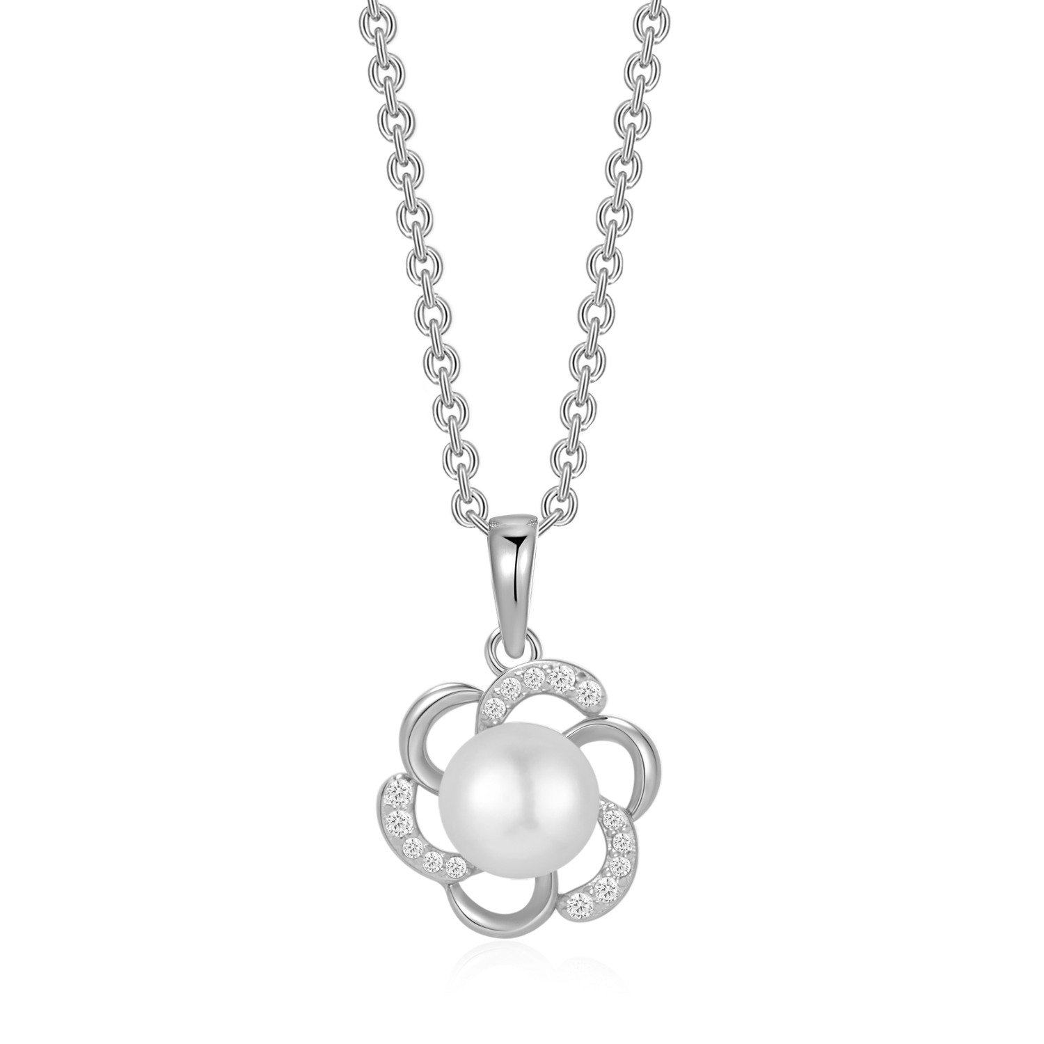 Elegant sølvhalskæde med et smukt blomstedesign, prydet med syntetiske cubic zirconia og en perle af ferskvand. Det rhodinerede sølv giver halskæden et skinnende, holdbart udseende, der holder sig flot over tid. Denne halskæde tilføjer et sofistikeret og tidløst touch til både festlige og hverdagens outfits.
