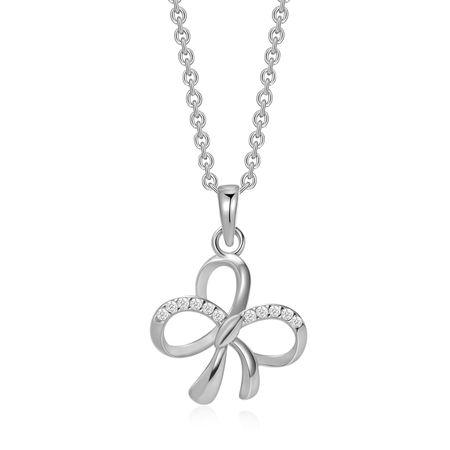 Elegant sølvhalskæde med et smukt sløjfedesign, prydet med syntetiske cubic zirconia for et glitrende og sofistikeret udtryk. Den rhodinerede sølvkæde giver halskæden et skinnende og holdbart look. Denne halskæde tilføjer et tidløst og feminin touch til både hverdagens og festens outfits, og er perfekt som gave eller til egen forkælelse.