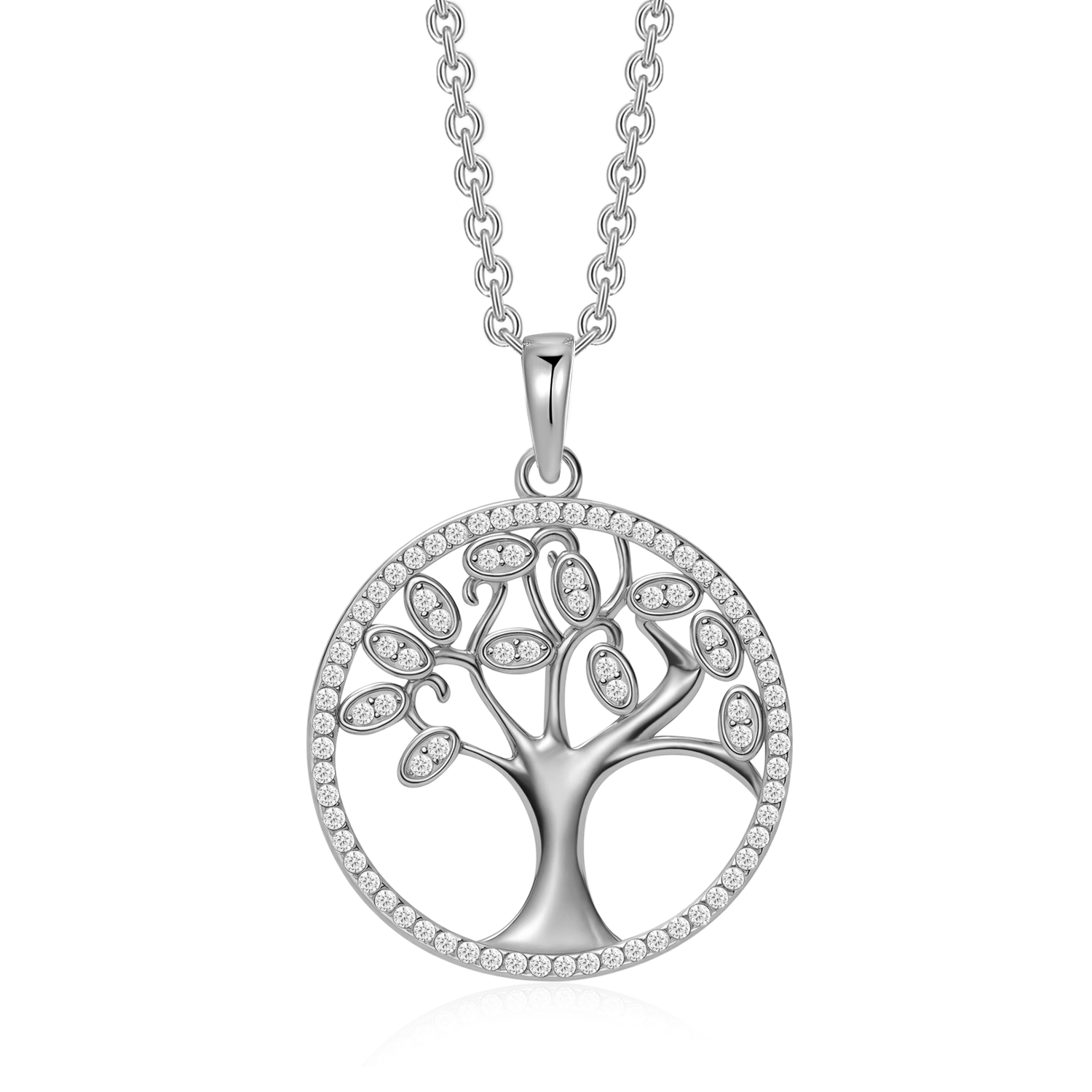 Smuk sølvhalskæde med et rhodineret livets træ-vedhæng, prydet med syntetiske cubic zirconia, som symboliserer livets forbundnehed og vækst. Den rhodinerede sølvkæde giver halskæden et skinnende og holdbart look. Dette tidløse smykke er perfekt til både hverdag og festlige anledninger og tilføjer et elegant og meningsfuldt touch til ethvert outfit.