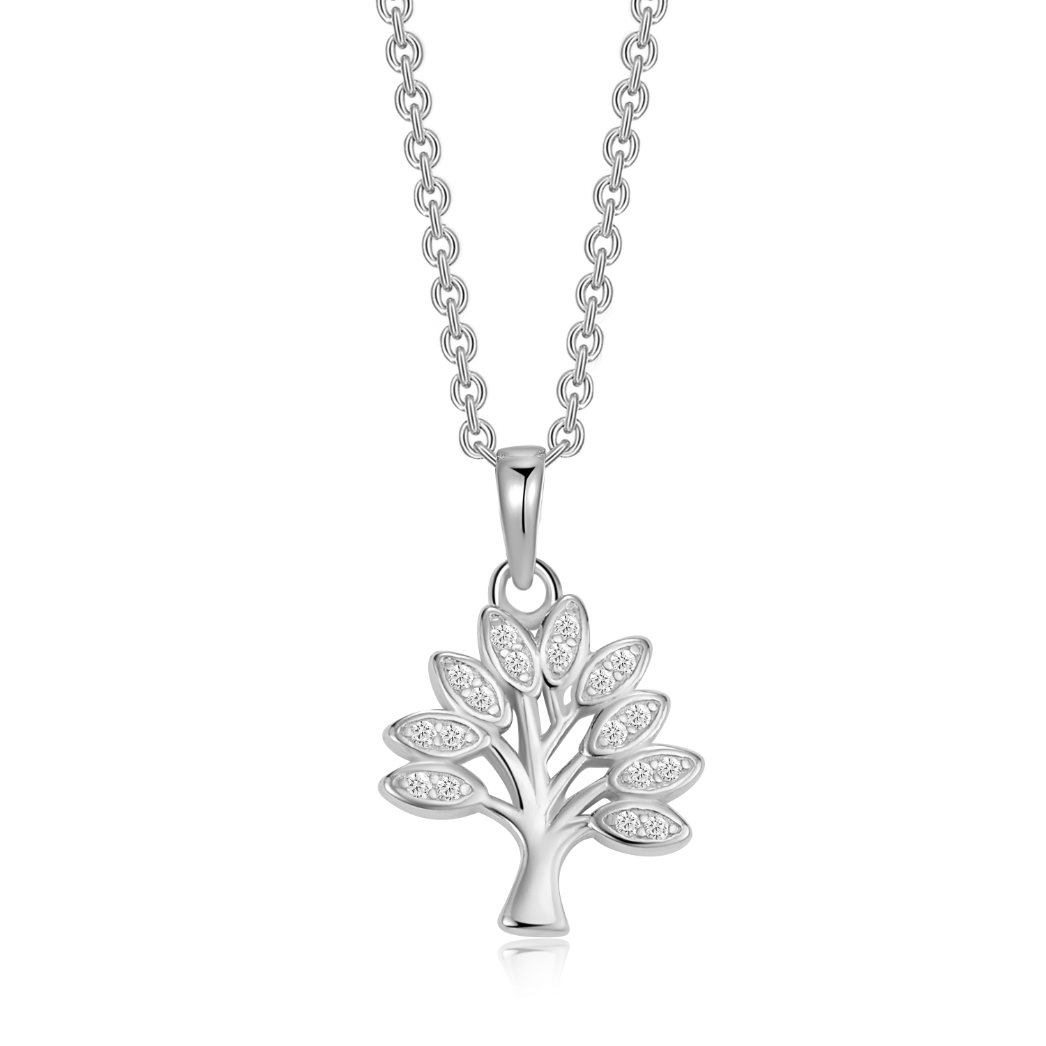 Elegant sølvhalskæde i rhodineret sterlingsølv med et smukt livets træ vedhæng. Træets grene og stamme er dekoreret med funklende syntetiske cubic zirconia, som symboliserer styrke, vækst og livets sammenhæng. Den rhodinerede overflade giver ekstra glans og beskytter mod anløbning. Et tidløst og meningsfuldt smykke, der passer perfekt til både hverdag og festlige lejligheder.