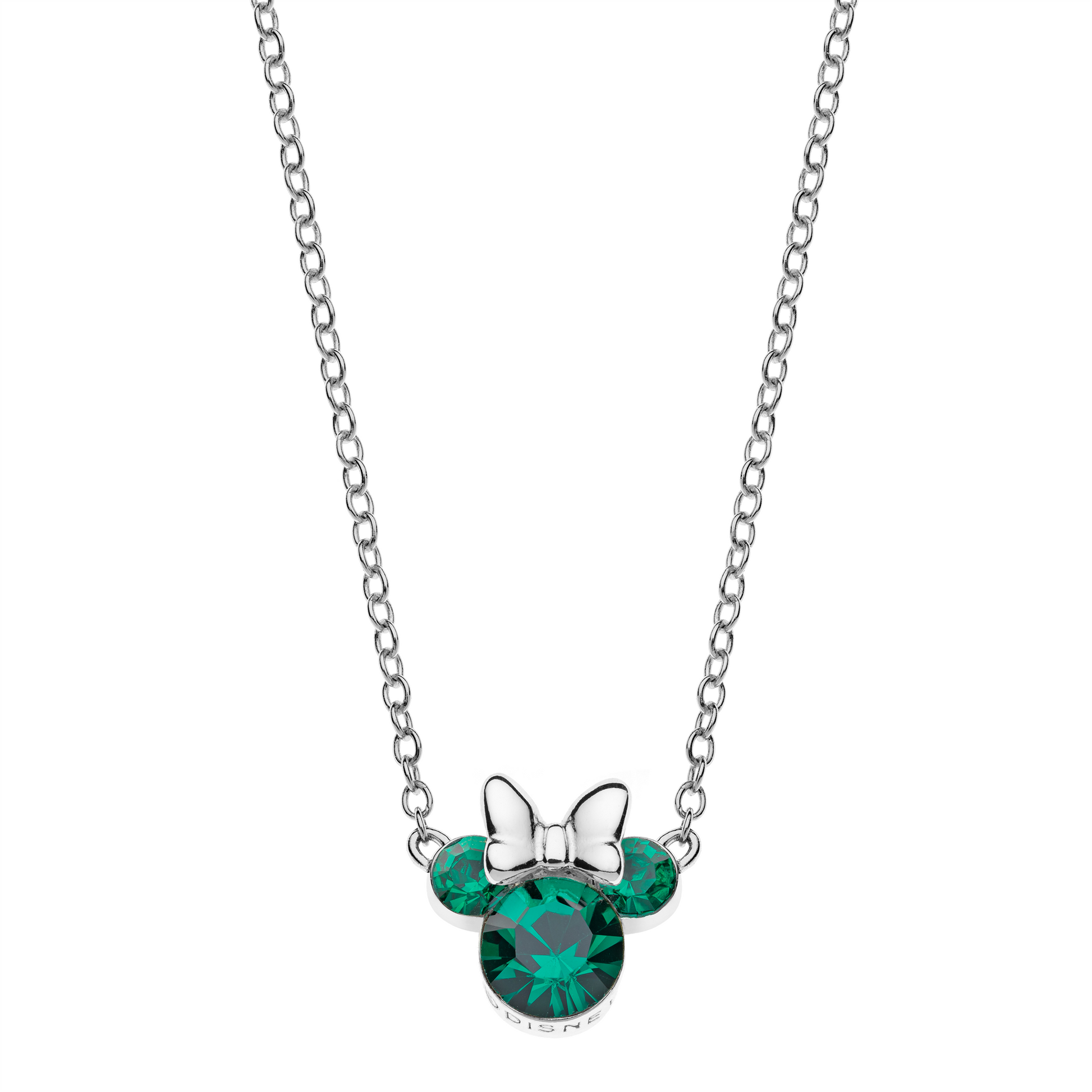 Smuk og farverig sølvhalskæde med Minnie Mouse vedhæng, udsmykket med en stor og to små syntetiske smaragder – symbol for maj måned. Smykket er elegant dekoreret med en blank sølvsløjfe, som giver et sødt og feminint udtryk. Den justerbare kæde gør halskæden ideel til både børn og voksne Disney-elskere. Et charmerende smykke, der spreder glæde og personlighed.