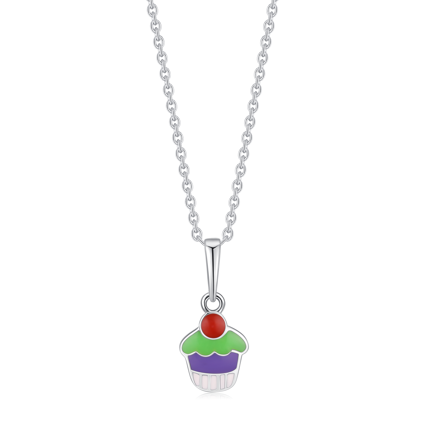 Sød og farverig sølvhalskæde i rhodineret sterlingsølv med et charmerende cupcakevedhæng. Vedhænget er dekoreret i rød, grøn, lilla og creme blyfri emalje, som giver et legende og livligt udtryk. Den rhodinerede overflade sikrer ekstra glans og beskytter mod anløbning. Et perfekt smykke til børn og unge, der elsker farver og et strejf af sødme i hverdagen.