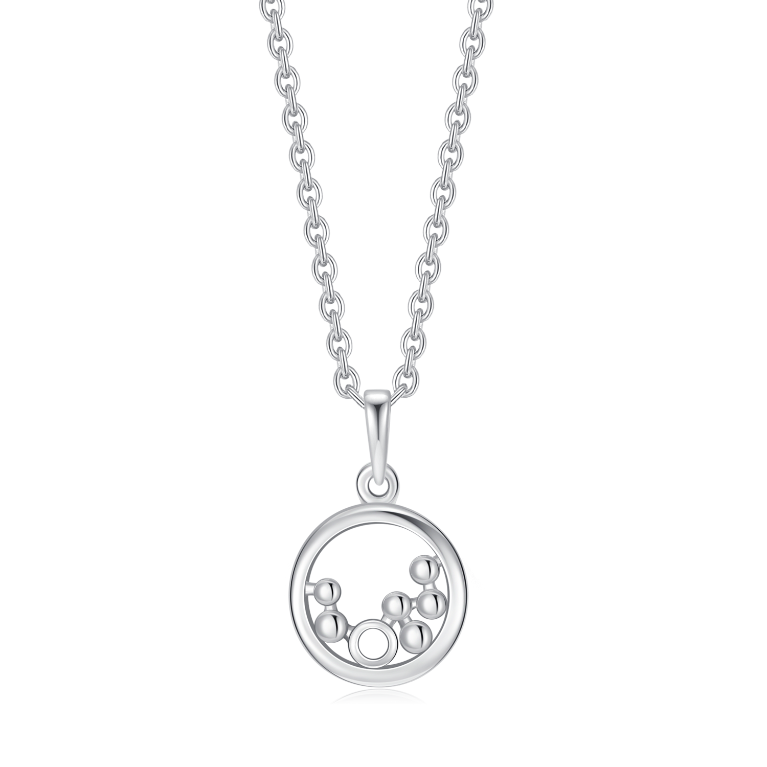 Stilren og elegant sølvhalskæde i rhodineret sterlingsølv med et moderne cirkelvedhæng pyntet med små sølvkugler. Det minimalistiske design giver et tidløst og sofistikeret udtryk, som passer perfekt til både hverdag og fest. Den rhodinerede overflade beskytter mod anløbning og bevarer smykkets smukke glans. Et klassisk valg for den, der værdsætter enkelthed og elegance.