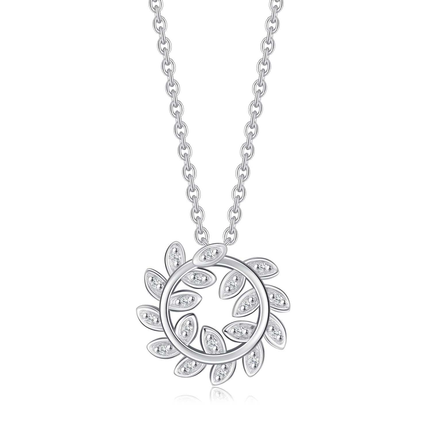 Elegant sølvhalskæde i rhodineret sterlingsølv med et smukt vedhæng formet som en cirkel og fine blade. Vedhænget er udsmykket med funklende syntetiske cubic zirconia, som tilfører et feminint og eksklusivt udtryk. Den rhodinerede overflade beskytter mod anløbning og giver ekstra glans. Et stilrent og tidløst smykke, der passer perfekt til både hverdag og festlige lejligheder.