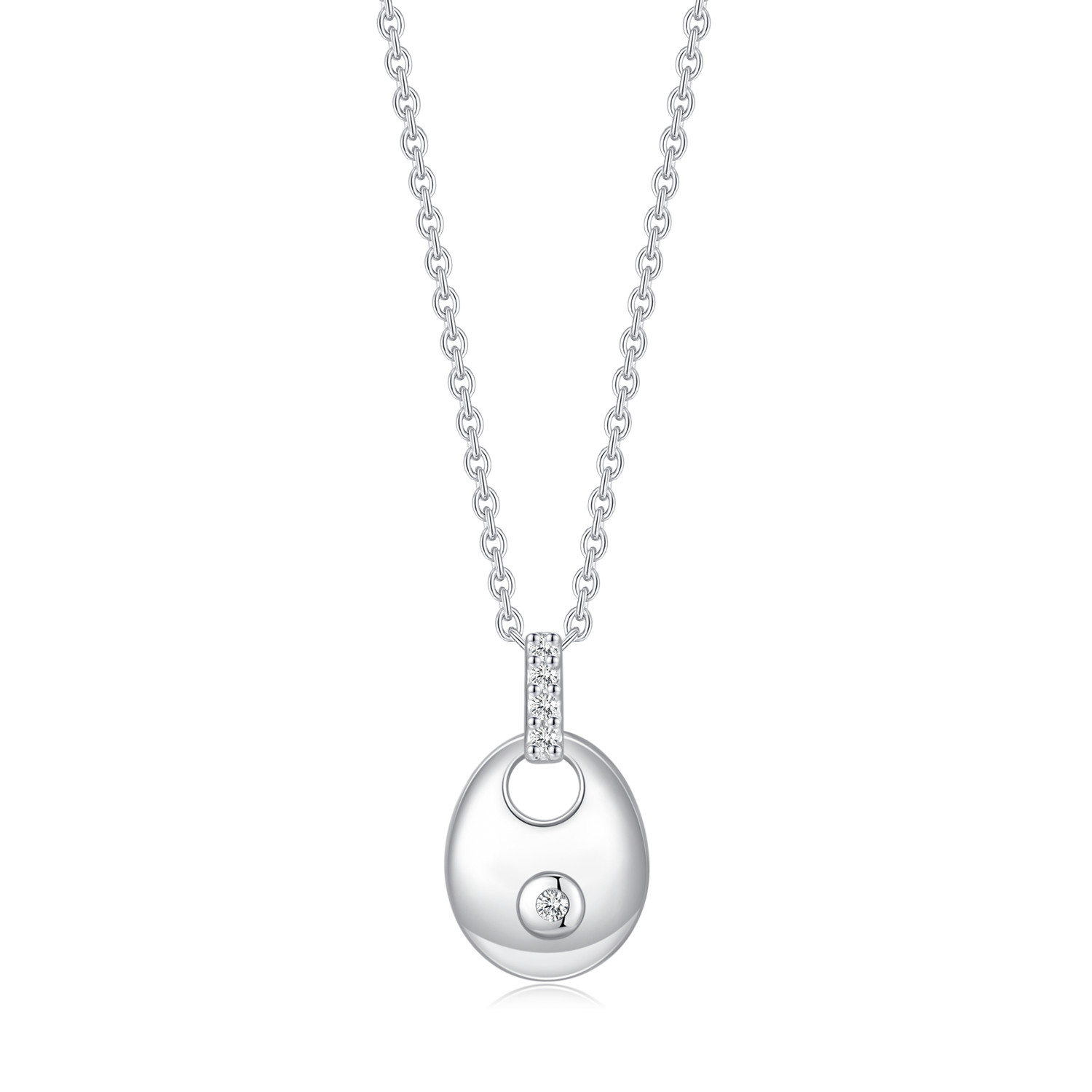 Denne stilfulde sølvhalskæde er designet med en rhodineret oval vedhæng, der prydes med syntetiske cubic zirconia – én i midten og én på øsknet. Vedhænget måler 15 x 9 mm, og kæden er lavet af rhodineret sølv med en justerbar længde på 42-45 cm. En perfekt halskæde til at tilføje elegance og glans til enhver anledning.