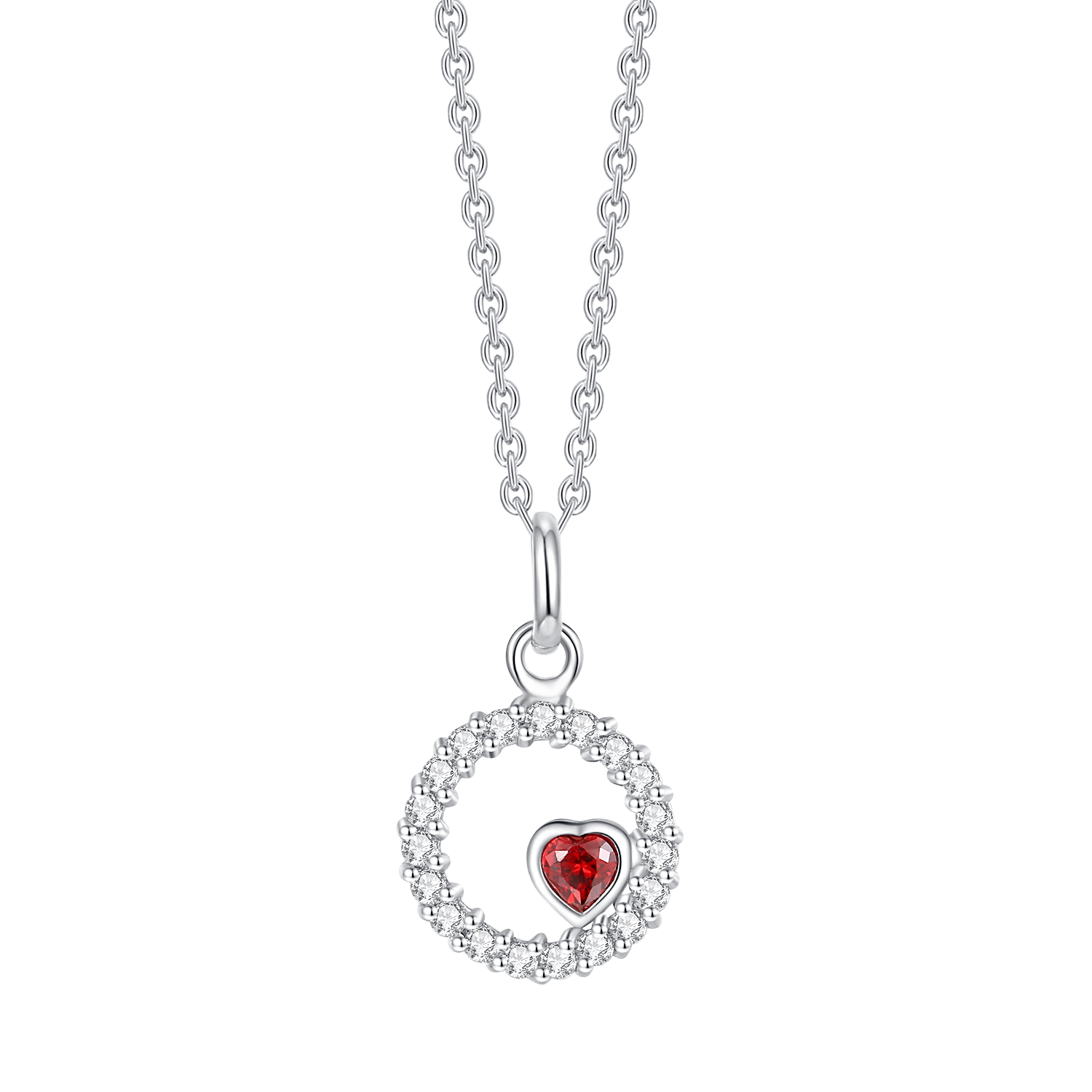 Denne elegante sølv halskæde fremviser en rhodineret cirkel med hvide syntetiske cubic zirconia langs kanten og et syntetisk rubin i midten i form af et hjerte. Cirklen måler 16 mm i diameter og kæden er lavet af rhodineret sølv. Kædens længde kan justeres mellem 42-45 cm, hvilket gør den ideel til både dagligt brug og specielle lejligheder.