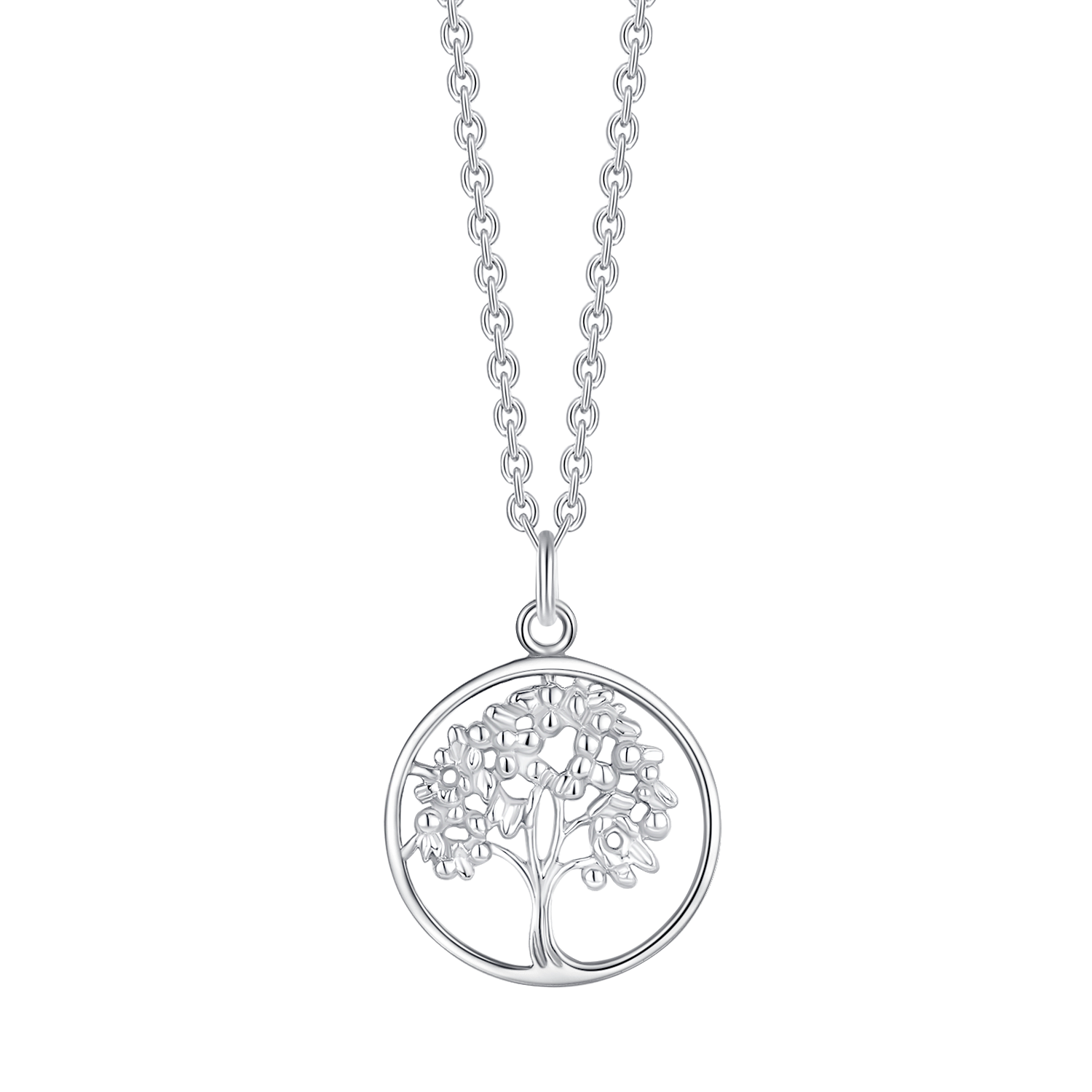 Denne smukke sølv halskæde har en rhodineret cirkel med et imponerende livets træ (Tree of Life) design, der symboliserer vækst og forbundethed. Vedhænget måler 21 x 21 mm og er lavet af rhodineret sølv for et elegant og holdbart finish. Kæden er justerbar mellem 42-45 cm, hvilket gør den perfekt til både hverdagsbrug og særlige anledninger.