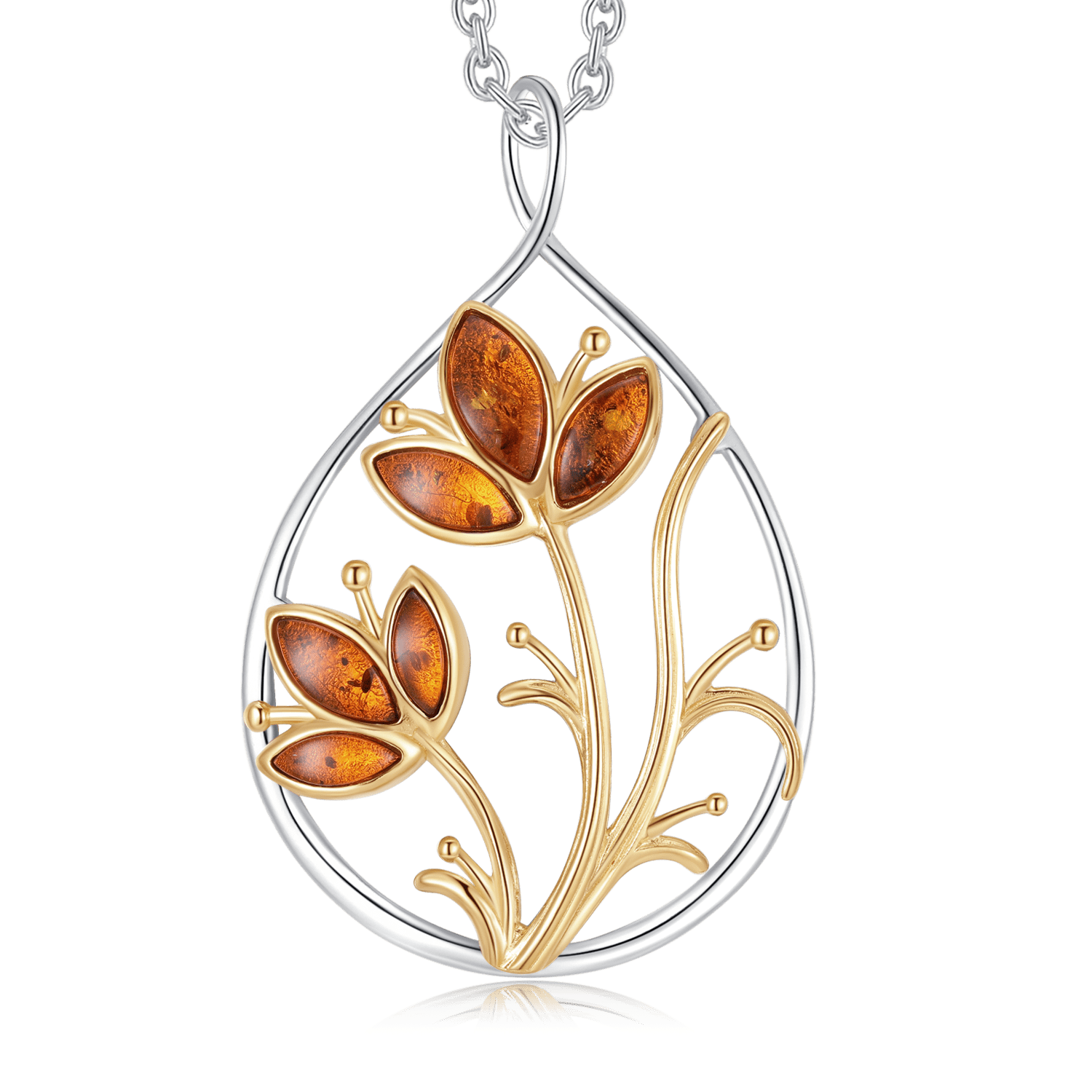 Denne smukke sølvhalskæde er rhodineret for at bevare sin glans og modstå anløbning. Det ovale vedhæng er kunstfærdigt designet med forgyldte grene og blomsterblade, smukt udsmykket med rav, der giver et naturligt og varmt udtryk. Halskæden kombinerer klassisk håndværk med moderne elegance og passer perfekt til både daglig brug og særlige anledninger.