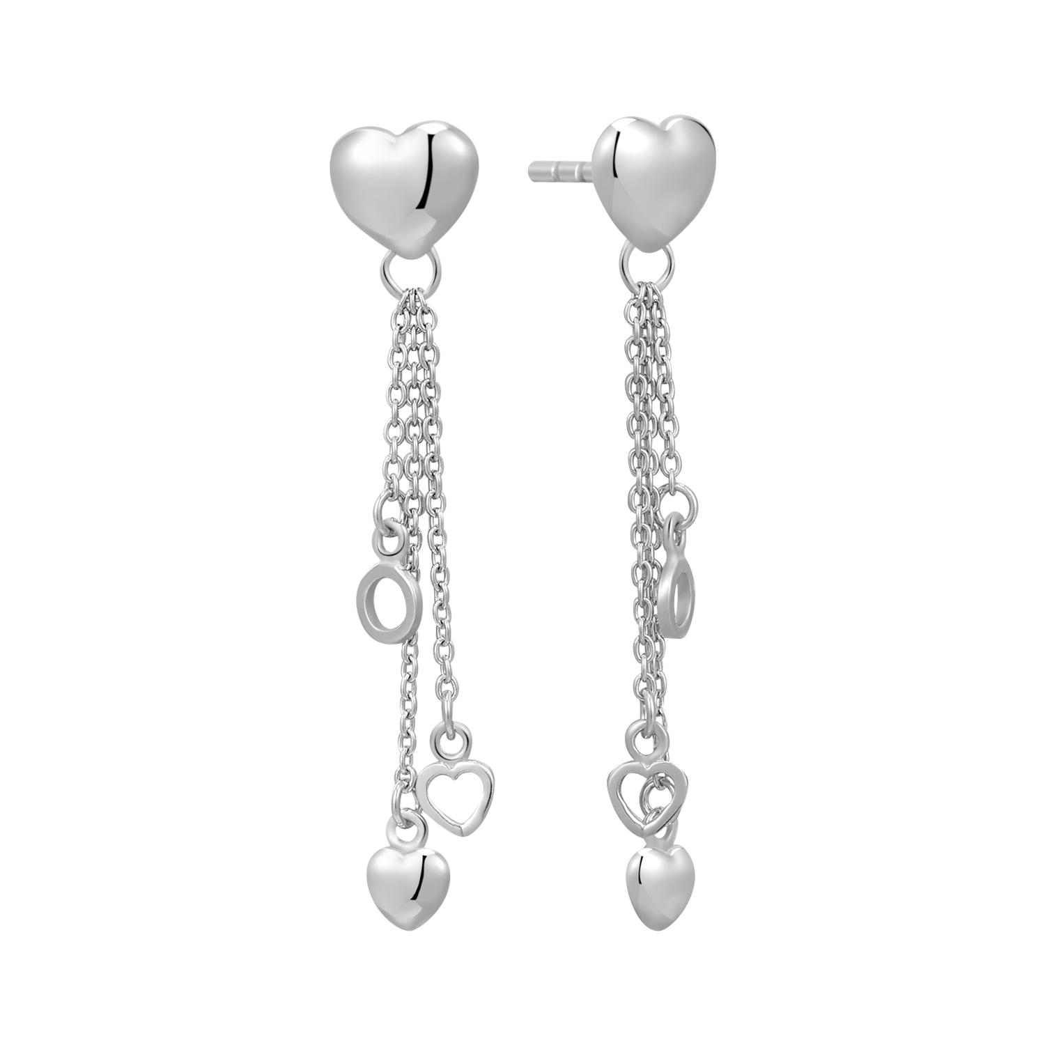 Elegant sølv ørehænger med et romantisk og moderne udtryk. Smykket er designet som et rhodineret hjerte, hvor tre fine kæder hænger ned og afsluttes med et hjerte, en cirkel og et lukket hjerte. Den blanke overflade giver et smukt skær, og det delikate design tilføjer et feminint og tidløst præg, perfekt til både hverdag og fest.
