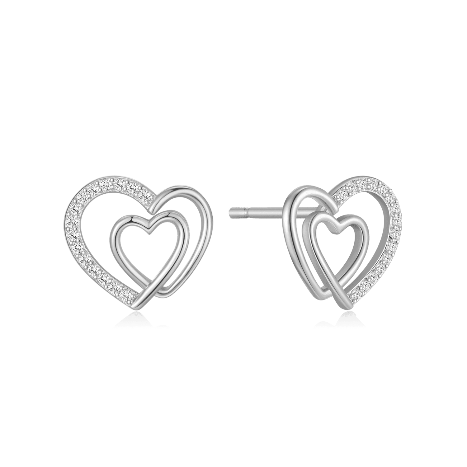 Romantiske sølv ørestikker med et smukt dobbelt hjerte-design, der symboliserer kærlighed og samhørighed. Øreringene er fremstillet i rhodineret sterlingsølv og udsmykket med funklende syntetiske cubic zirconia-sten, som giver et elegant og glitrende udtryk. Perfekte som en betagende gave eller et tidløst smykke til hverdagsbrug og særlige anledninger.