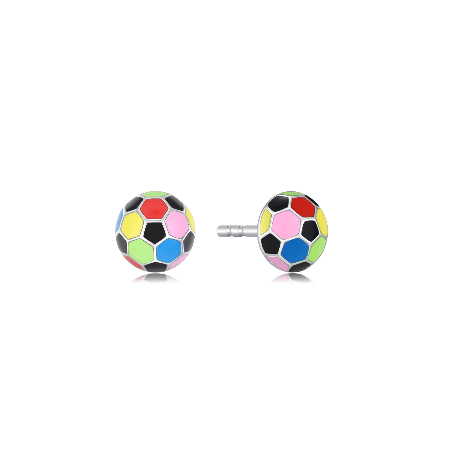 Sporty og stilfulde sølv ørestikker designet som små fodboldbolde. Ørestikkerne er rhodinerede for ekstra glans og holdbarhed og dekoreret med multi-farvet, blyfri emalje, der giver et livligt og unikt udtryk. Med deres kompakte størrelse på 5 mm er de perfekte til både børn og voksne, der elsker sport og ønsker et sjovt, men elegant smykke.