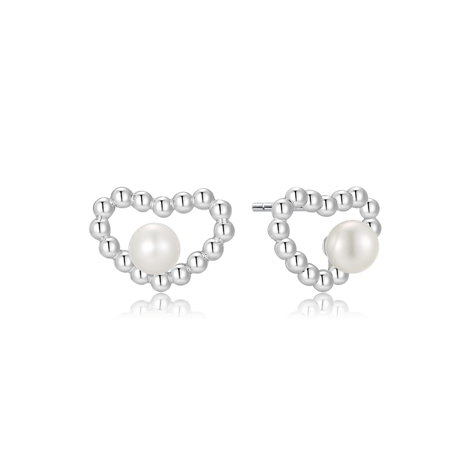 Disse sølv ørestikker er fremstillet i rhodineret sølv og formet som delikate hjerter sammensat af små prikker, hvilket giver et let og feminint udtryk. I midten pryder en smuk ferskvandsperle, der tilfører et klassisk og elegant touch. Kombinationen af den blanke sølvoverflade og den naturlige perle gør ørestikkerne ideelle til både daglig brug og særlige lejligheder.