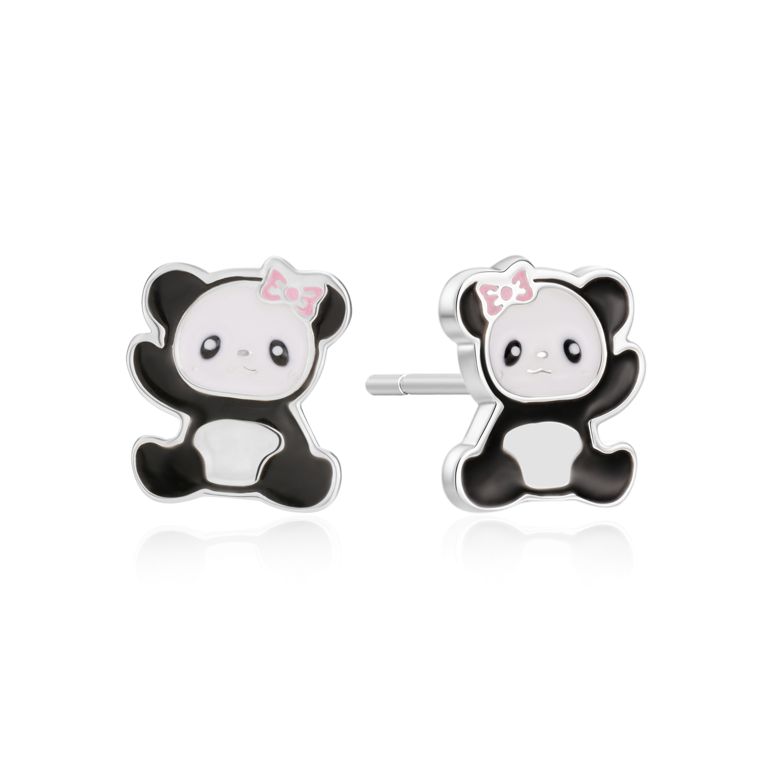 Disse søde og detaljerede sølv ørestikker er designet som små pandaer med hvidt hoved, sort krop og en fin pink sløjfe. Fremstillet i sterlingsølv og dekoreret med blyfri emalje, der giver et farverigt og livligt udtryk. Det legende design gør dem ideelle til børn eller enhver, der ønsker et sjovt og unikt smykke med et charmerende udtryk.