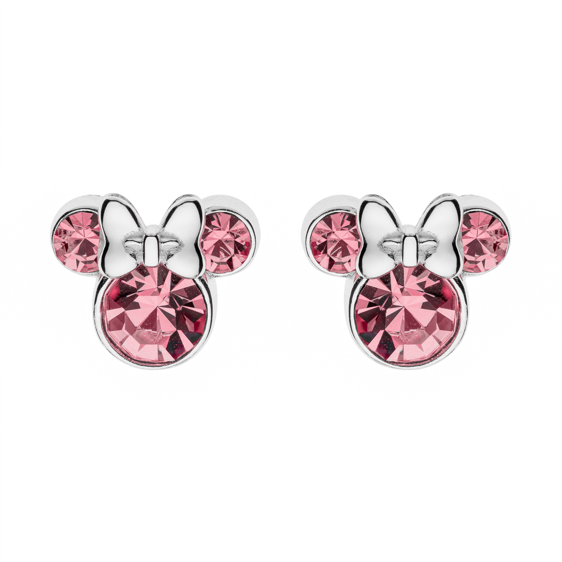 Disse charmerende sølv ørestikker er inspireret af det ikoniske Minnie-design og består af én stor samt to små syntetiske roséfarvede sten. Øverst prydes de af en elegant sølvsløjfe, der tilfører et feminint og legende udtryk. De kombinerer sødme og stil på perfekt vis og passer ideelt til både hverdag og festlige lejligheder.
