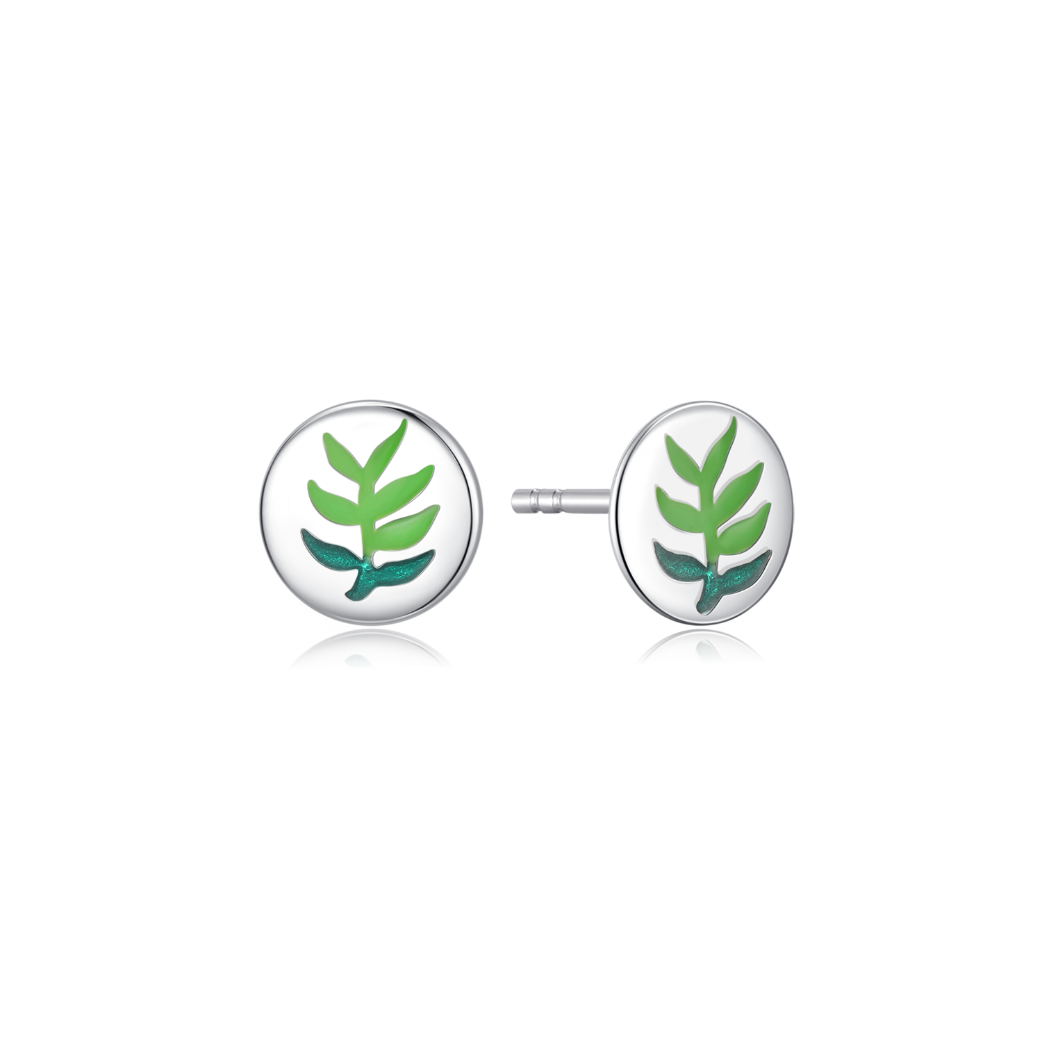 Disse rhodinerede sølvørestikker er udformet som små cirkler dekoreret med grønne blade i blyfri emalje, inspireret af livets træ. Det detaljerede bladmotiv symboliserer vækst, harmoni og styrke, mens den rhodinerede overflade giver ekstra glans og modstandskraft mod misfarvning. De kompakte øreringe kombinerer symbolsk betydning med et elegant, farverigt udtryk og passer perfekt til både børn og voksne.